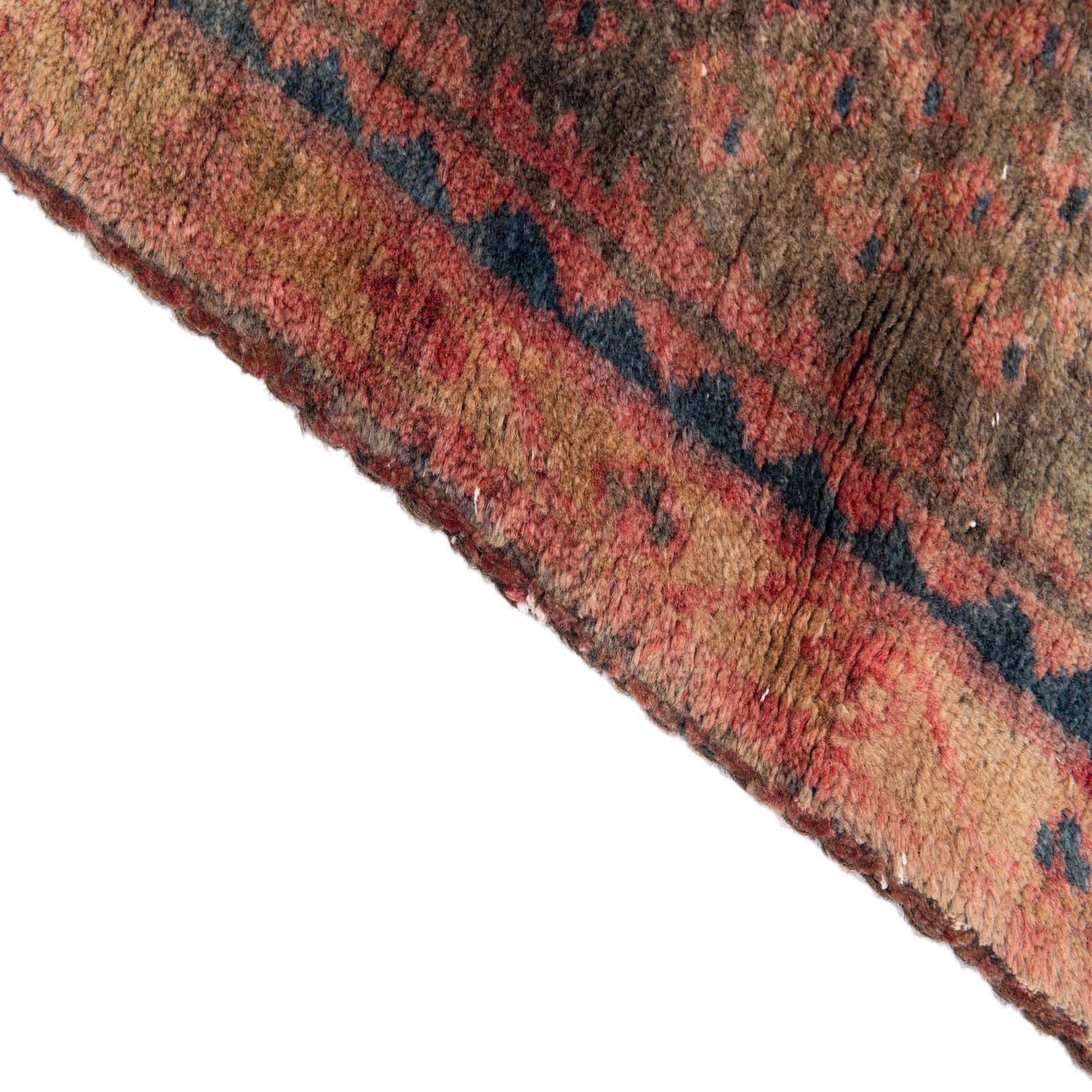 Primary color is Brown. Colors in this rug include: Brown, Navy Blue, Rust Red, Beige.