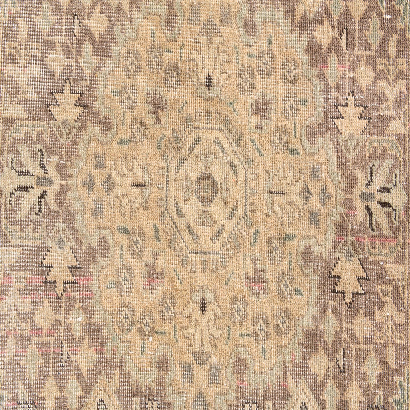 Hand-knotted from 100% wool, this rug presents a traditional medallion layout set on a warm brown field. A soft beige centerpiece and surrounding floral and geometric motifs sit quietly against the background, while rust red accents punctuate the design. The pattern is intentionally softened and low-contrast, giving the motifs a worn, vintage character that reads as lived-in rather than stark.