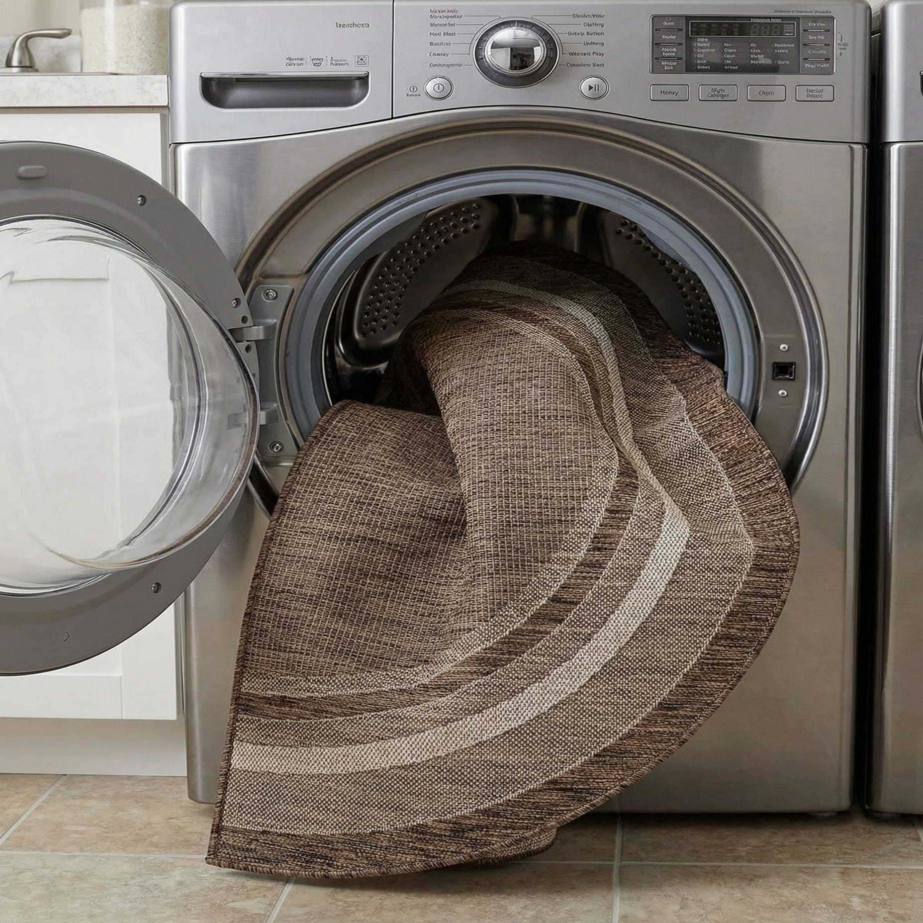 Place it at an entry, in front of a fireplace, or on a covered porch where its shape complements thresholds and curved architectural details. It pairs naturally with warm wood floors, leather seating, and metal accents for a transitional or rustic look, and also works with painted trim and light linens for a coastal or modern farmhouse scheme. The neutral brown base and restrained ivory and black accents make it easy to layer with a larger rectangular rug or use alone to define a small, functional space.