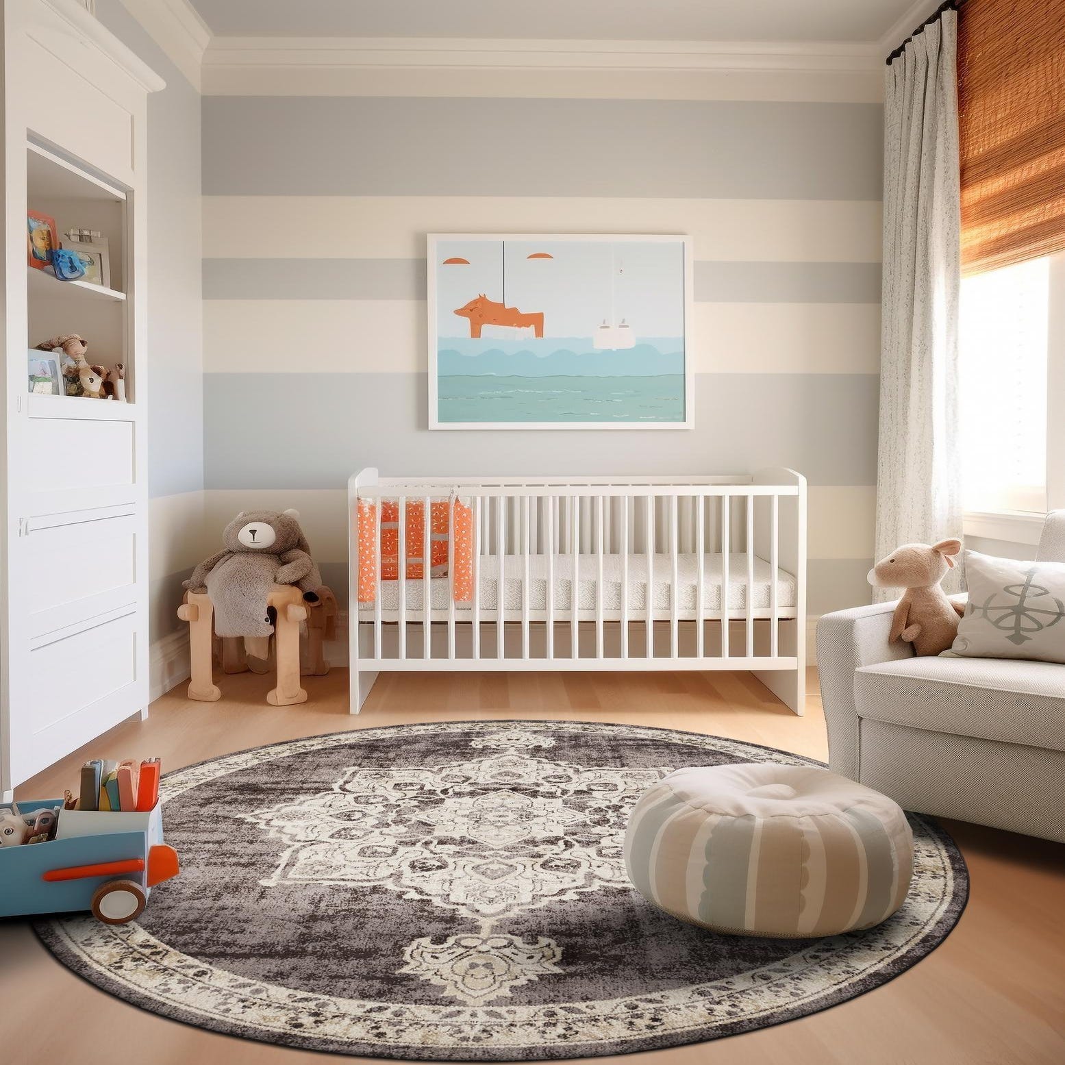 The texture delivers a soft underfoot experience, while the rug's construction ensures it is stain-resistant and shed-free, maintaining a clean and well-kept appearance over time. Its round shape makes it particularly well-suited for anchoring smaller seating areas or for use beneath round dining tables, accentuating the symmetry of the space. This piece would harmonize seamlessly with classic, transitional, or even contemporary decor, adding depth and a sense of history to modern interiors or complementing the warmth of traditional settings.