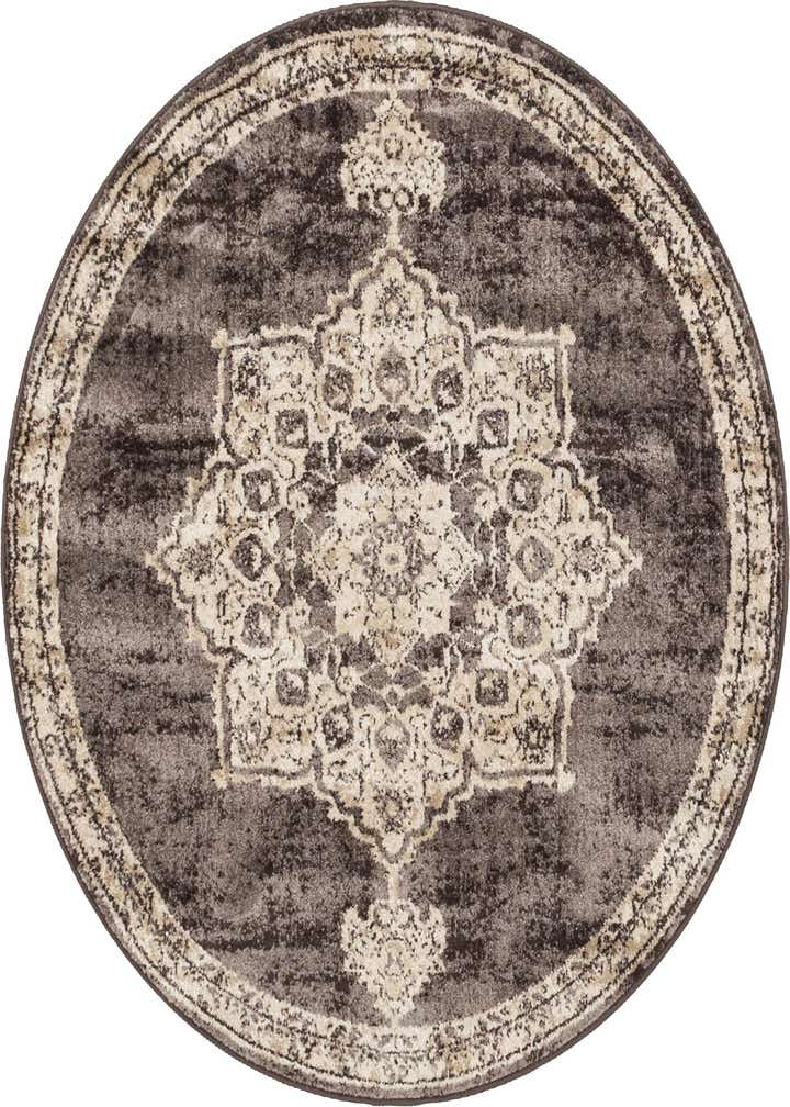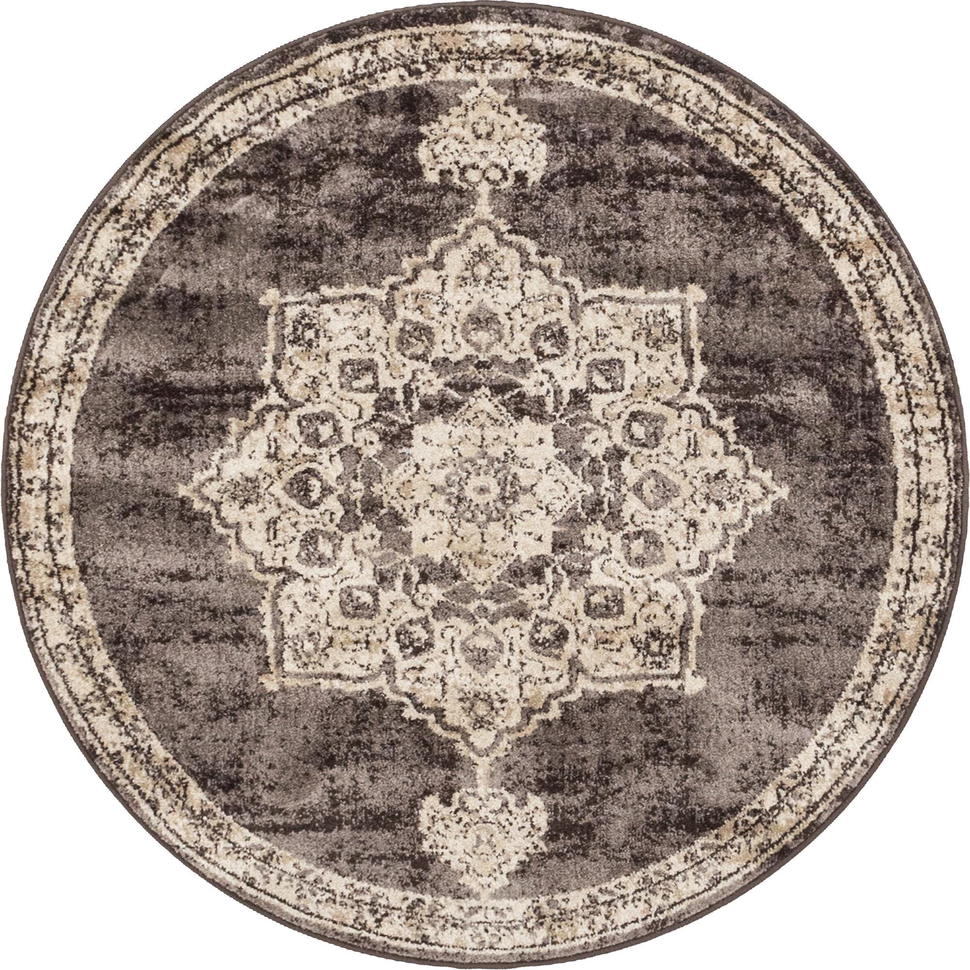 The Eden Collection presents a machine-woven, 100% polypropylene 4 Ft Round rug, offering durability and ease of maintenance. This rug features a central medallion pattern encased within a detailed border, rendered in a palette of brown, beige, ivory, and light brown, with the primary background color being a rich brown. The design carries traditional influences that provide a touch of elegance and sophistication to any space.