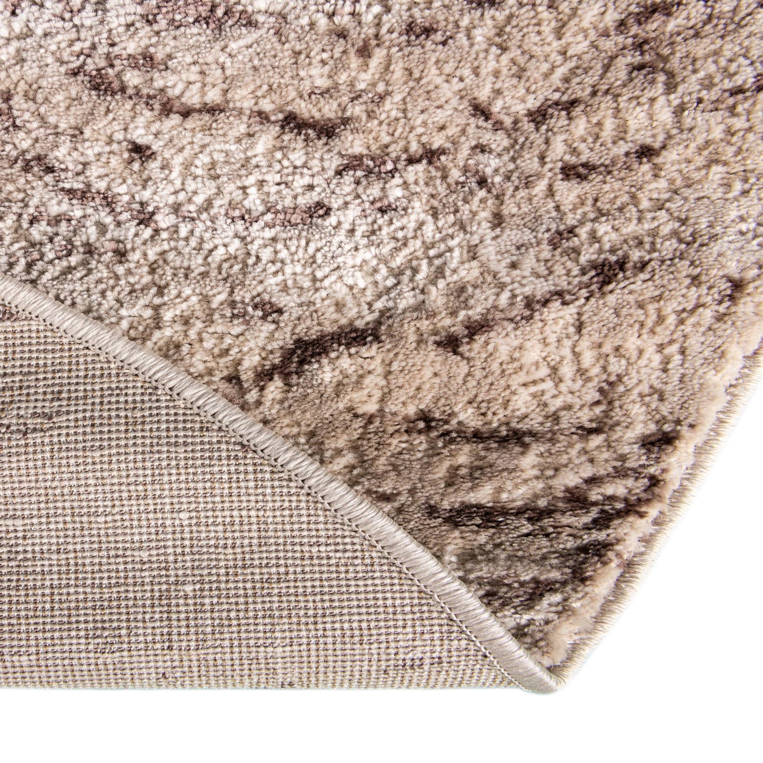 A round rug with an abstract, brushstroke-style pattern that flows across a warm brown background, highlighted by bands of beige, ivory and light brown. The irregular markings create gentle movement and a contemporary, relaxed look that pairs easily with both modern and transitional decor. Machine-made from 65% polypropylene and 35% polyester, the pile feels soft and slightly dense underfoot with a low to medium profile and a subtle luster from the polyester yarns.