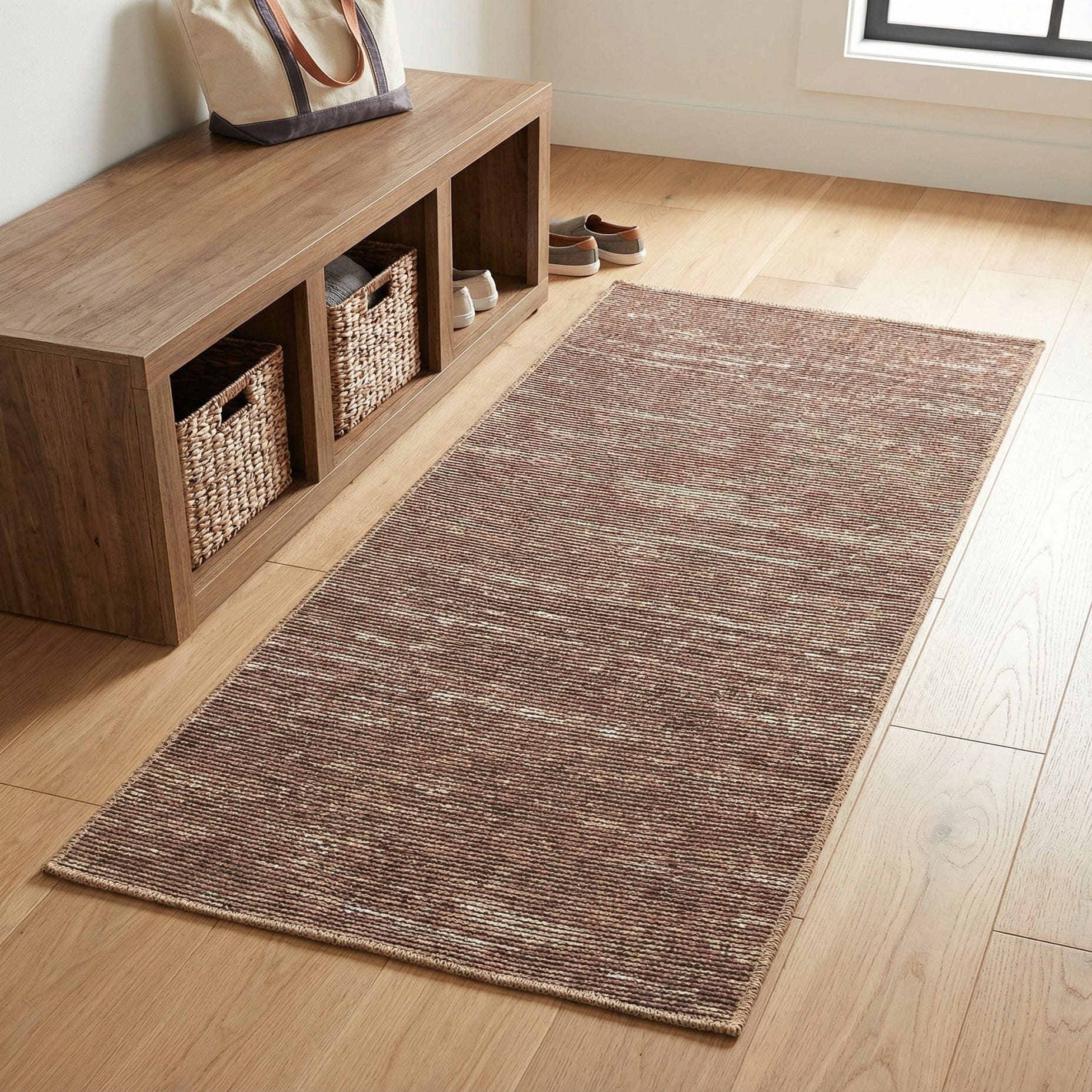 This runner works well where a narrow, warm grounding element is needed — think hallways, entryways, or alongside a bed. It pairs naturally with warm wood tones, cream or beige upholstery, and mixed-metal accents, and fits a range of interiors from contemporary and transitional to rustic or mid-century modern. Use it under a console or in a galley kitchen to add texture without competing with existing patterns.