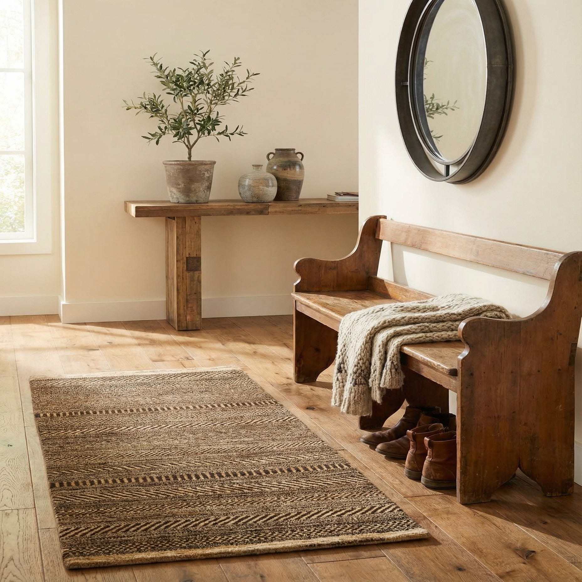 A 4 Ft runner rug in brown and tan with a modern striped and oriental pattern, perfect for a hallway.