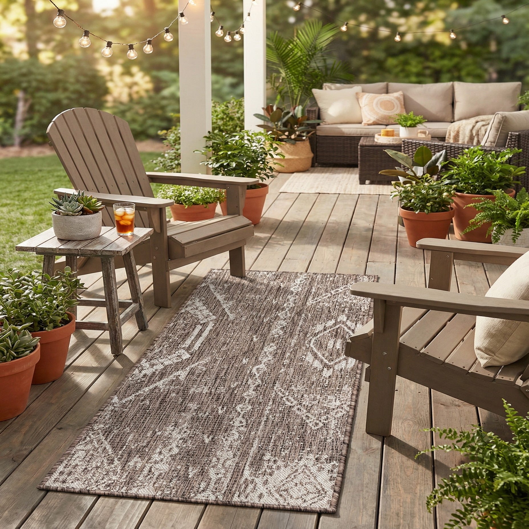 A 4 ft runner rug from the Outdoor Bohemian collection, featuring a modern geometric pattern in browns and tans, suitable for indoor/outdoor use.