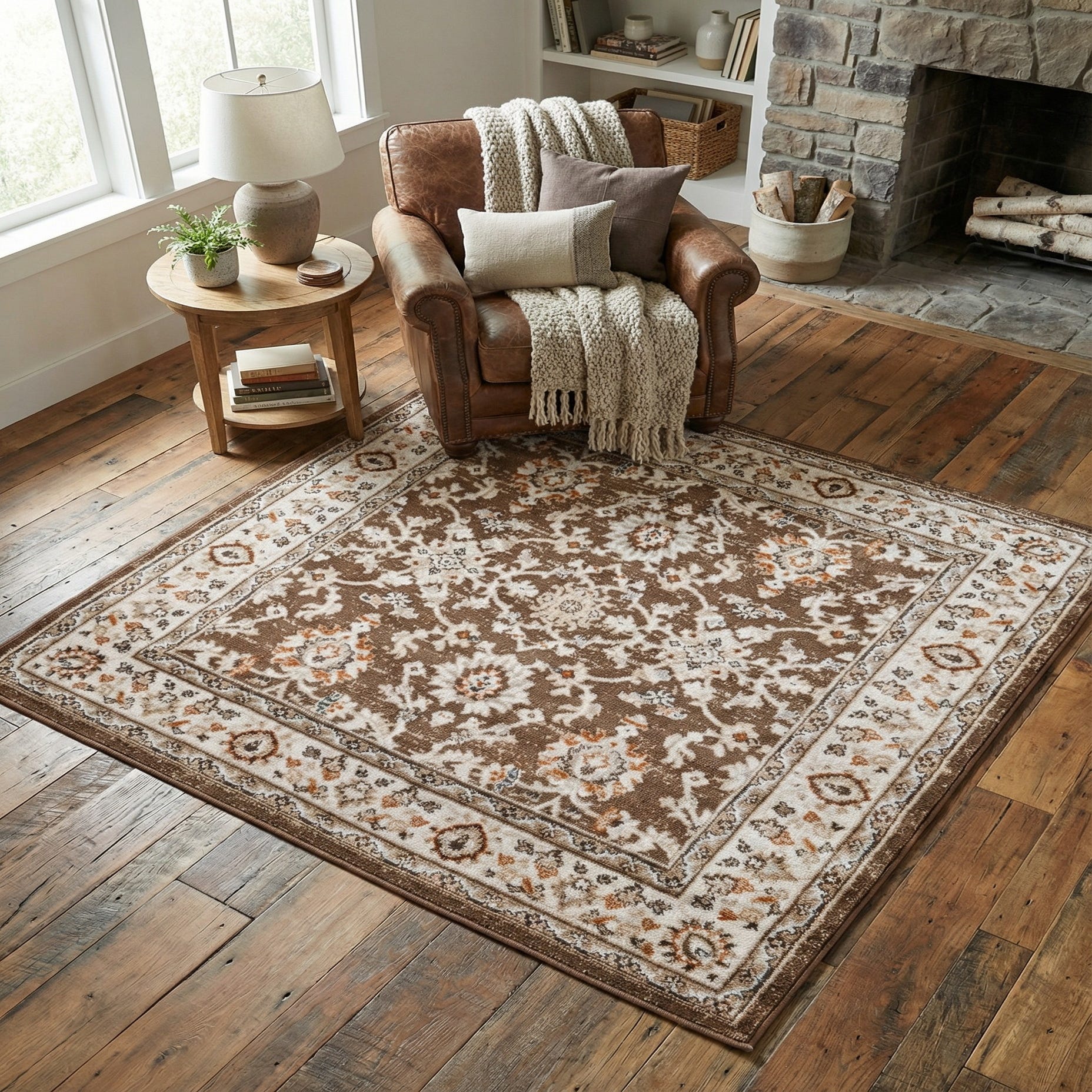 This stain-resistant rug is effortless to maintain, providing both style and practicality. It finds its place seamlessly within various decor settings, from the traditional to the more eclectic. It can serve as a defining piece in a living room or add warmth to a bedroom. Its earthy tones complement wooden furniture and natural elements, and its square shape offers a unique alternative to the typical rectangular rug, providing an opportunity to create a distinct and engaging area within the home's layout.