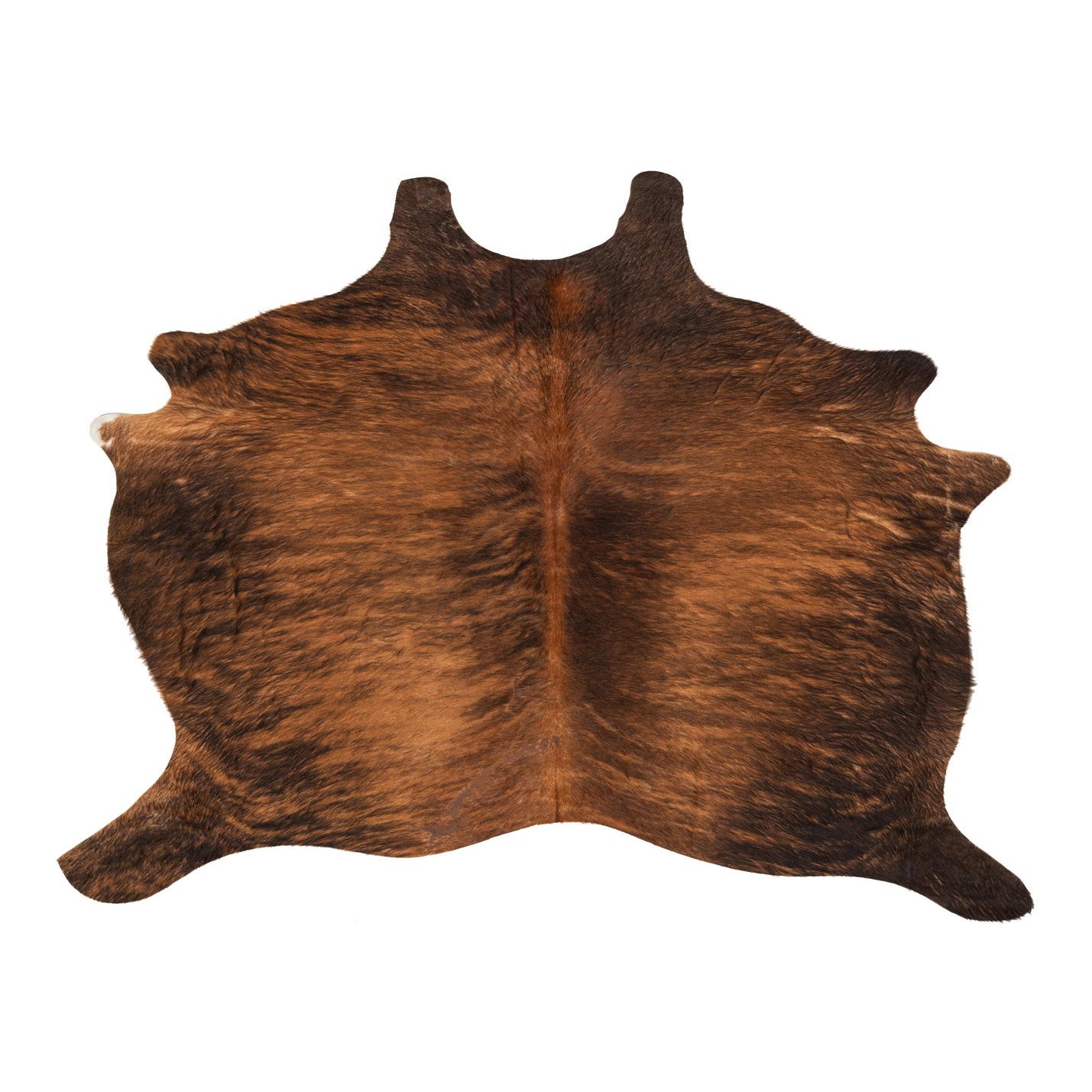 A 4' 4 x 4' 10 square cowhide rug featuring natural brown and tan brindle patterns, ideal for a modern living space.
