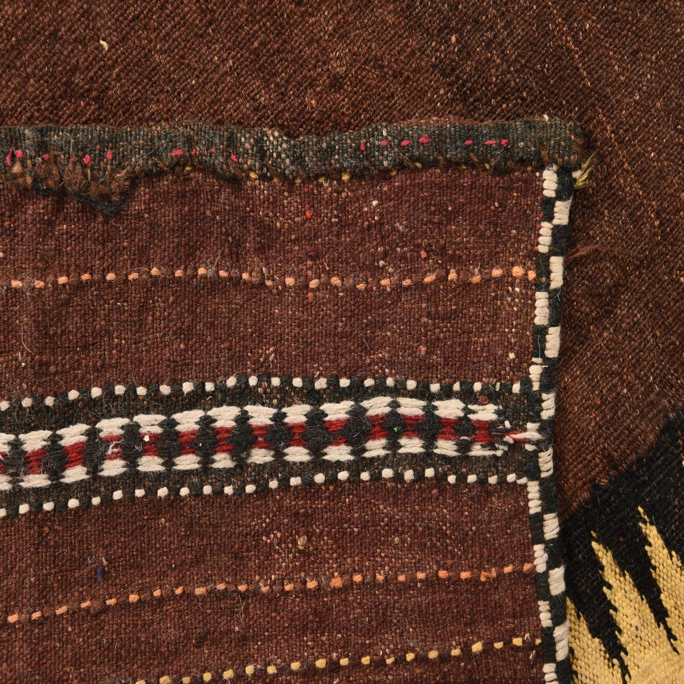 A square Kilim Fars rug in browns and tans, featuring a central brown field bordered by a yellow and black sawtooth pattern, surrounded by colorful tribal motifs.