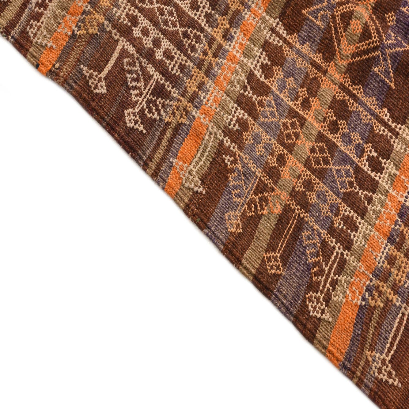 The Kilim Fars collection offers a 4x11 Ft runner handwoven with 100% wool, exemplifying traditional craftsmanship. The piece features a rich, brown background with an intricate pattern comprising hues of light blue, light green, olive, orange, purple, tan, light brown, and beige. The pattern is an authentic display of geometric shapes and tribal motifs that contribute to its distinct aesthetic. Texturally, the wool construction provides a natural feel underfoot and ensures durability, suitable for high-traffic areas. The inclusion of fringe adds to its traditional charm.