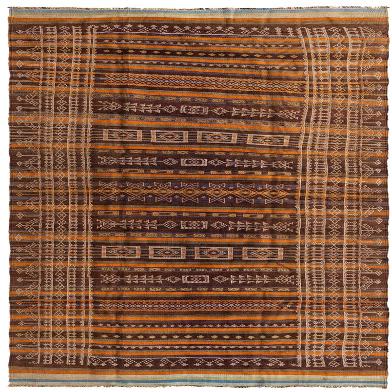 Primary color is Brown. Colors in this rug include: Brown, Light Blue, Light Green, Olive, Orange, Purple, Tan, Light Brown, Beige.