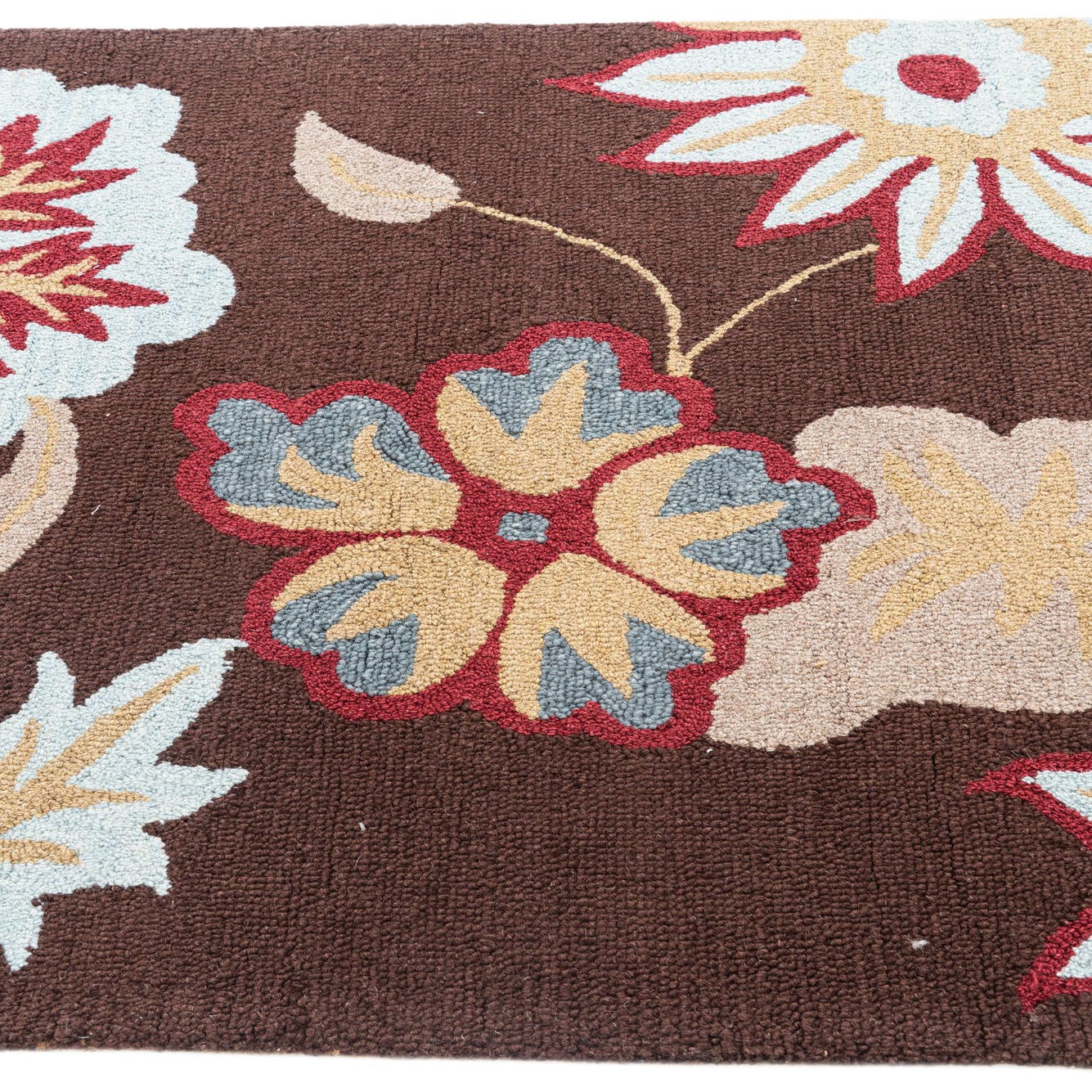 This Agra collection rug presents a captivating floral pattern with a harmonious blend of colors set against a warm brown background. The botanical elements, rendered in shades of burgundy, light blue, gray, and beige, are thoughtfully tufted to create a distinct, raised texture that invites both visual and tactile interest. Hand-tufted craftsmanship of wool and cotton ensures a durable and plush pile, making this 4x6 rug a comfortable and stylish addition to any room.