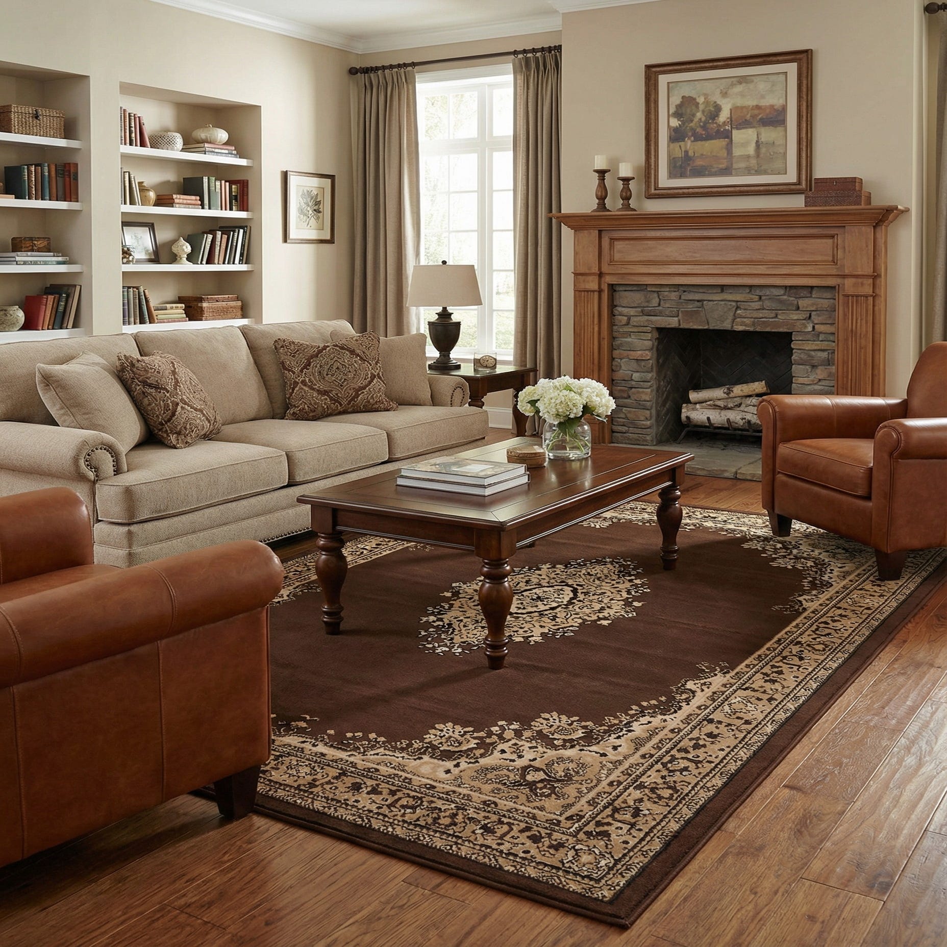The rug's design, enhanced by a stain-resistant and shed-free construction, lends itself well to a variety of interior settings. It is a suitable choice for anchoring furniture in a classic living room, adding warmth to a study, or complementing the elegant fixtures in a formal dining space. Its time-honored pattern can stand as a focal point in minimalist decors or harmonize with more traditional furnishings and wooden accents.