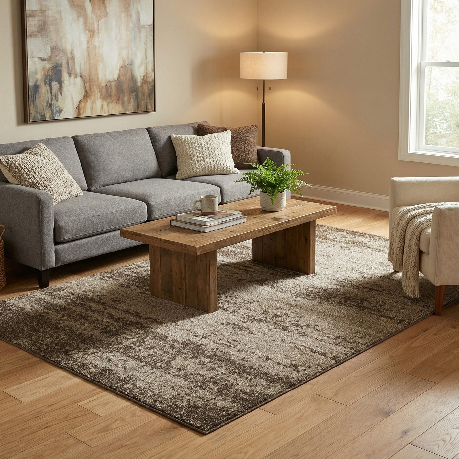 Machine made from 100% polypropylene, the pile is low-profile and tightly constructed, so the surface feels smooth and slightly plush underfoot without the bulk of a high-pile rug. The low sheen of the fibers catches light in places, enhancing the textured look rather than competing with it. Place this rug to anchor a sofa and coffee table in a living room, warm up a bedroom beside the bed, or define a home office or reading nook; its neutral brown and ivory palette pairs nicely with leather furnishings, cream linens, warm wood tones, and metal accents.