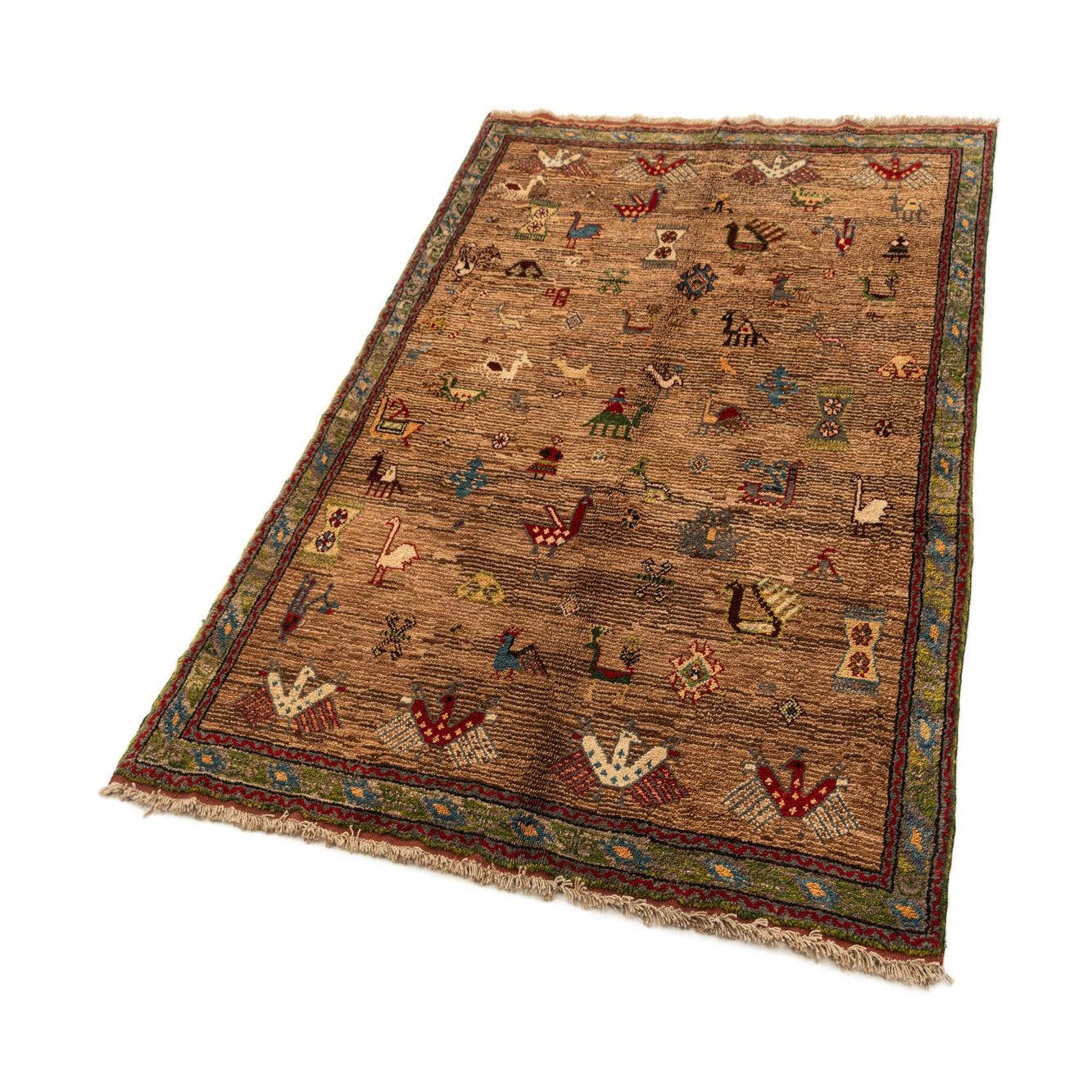 A 4x6 rectangular brown wool rug with a colorful, whimsical animal and bird pattern, featuring a multi-colored border.