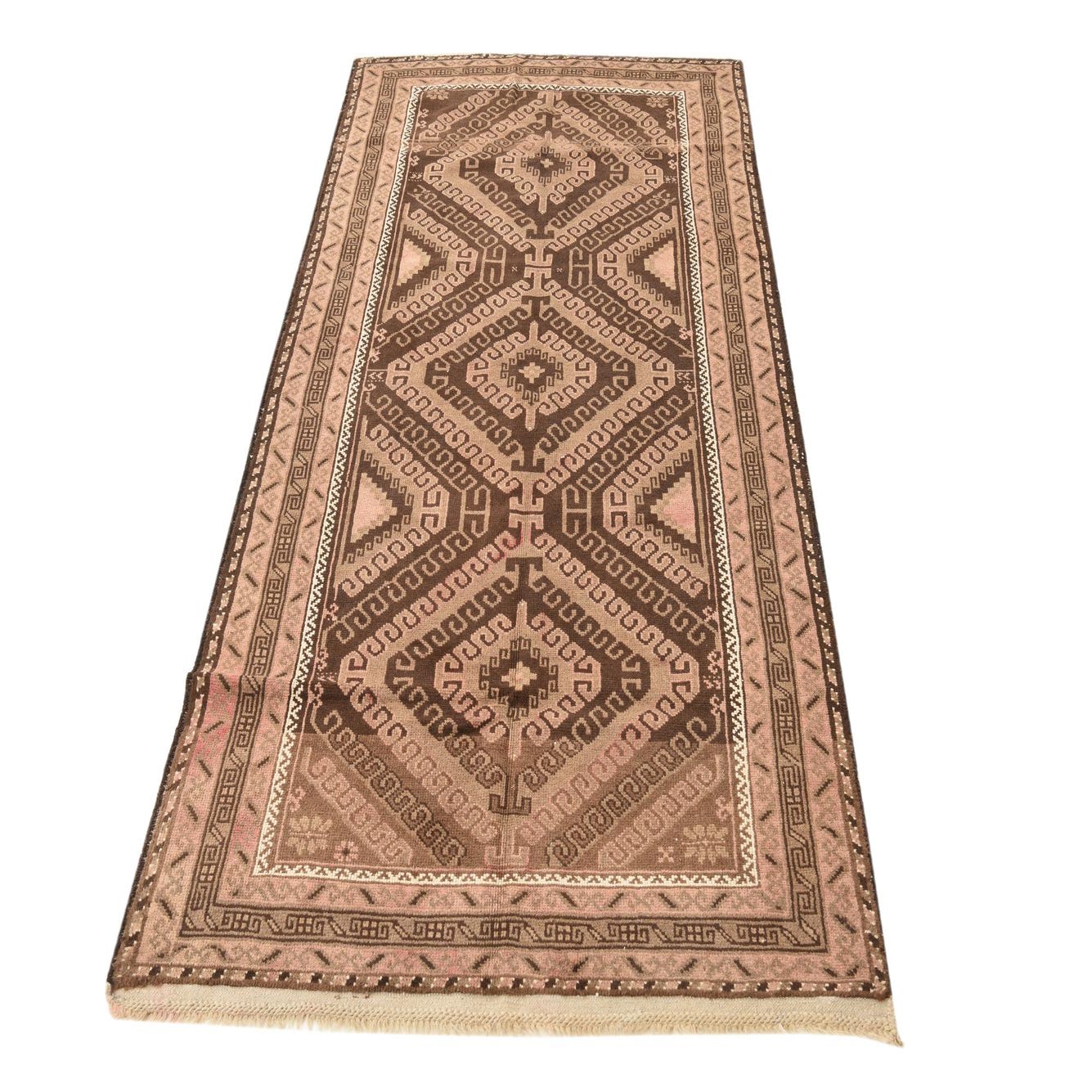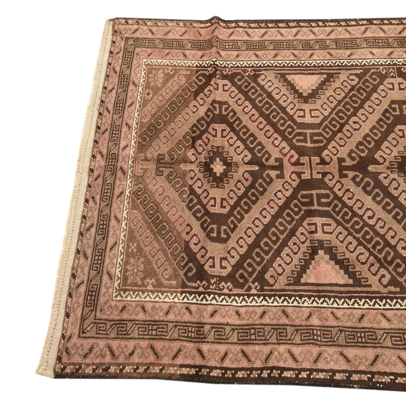 A 4x6 rectangular Balouch rug with a traditional tribal pattern in various shades of brown and tan, featuring geometric motifs and a detailed border.