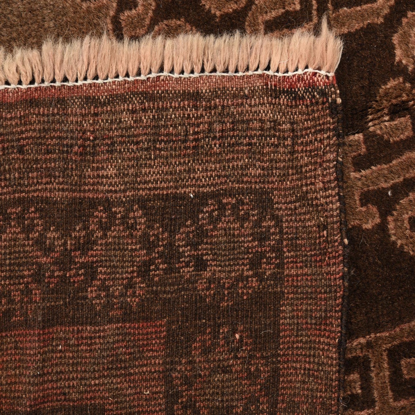 A 4x6 rectangular Balouch wool rug featuring traditional tribal patterns in shades of brown and tan.