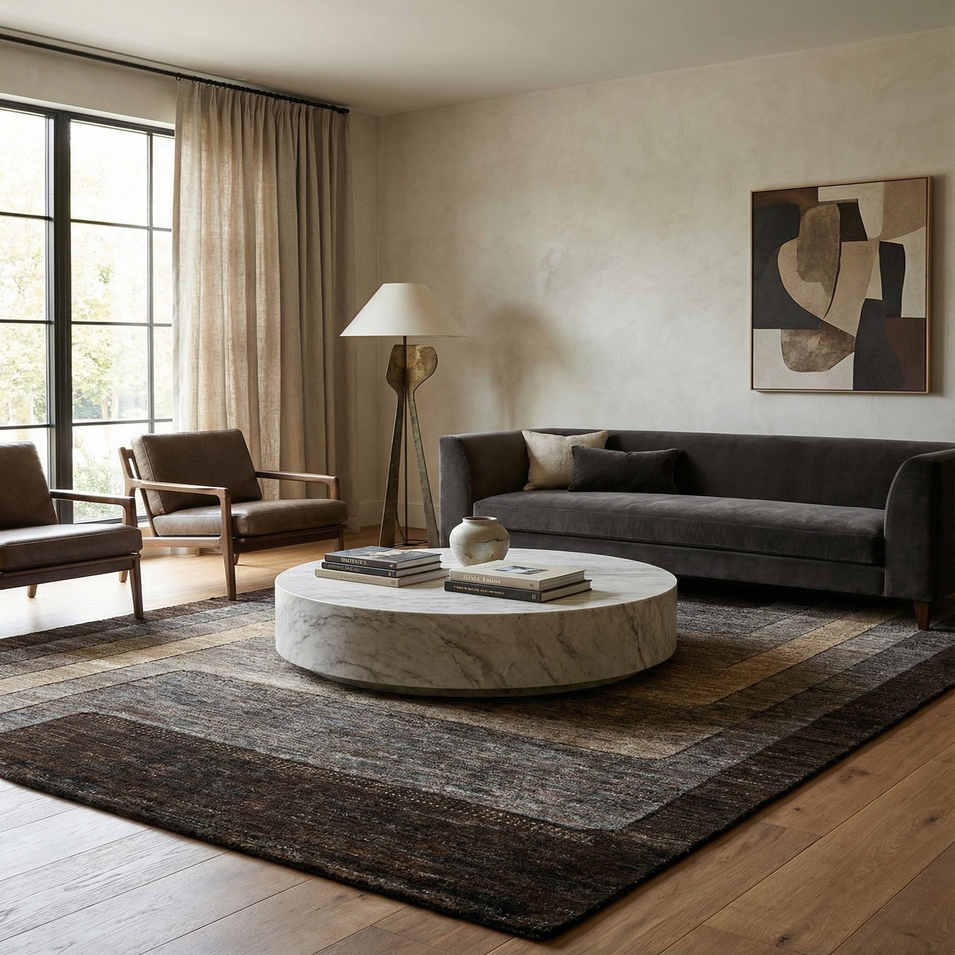 With a woolen texture that provides both warmth and comfort underfoot, this rug's earthy palette and sophisticated design make it versatile for various interior settings. It can seamlessly integrate into a minimalist decor scheme, enhance a modern industrial loft with its structural motif, or provide a grounding element in a mid-century modern room. The Baxjasta's balanced composition of color and form aligns well with furnishings that feature natural materials and clean lines.