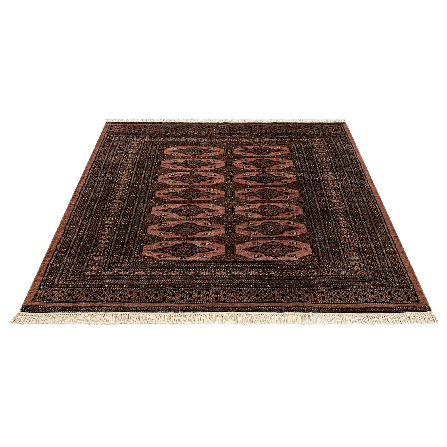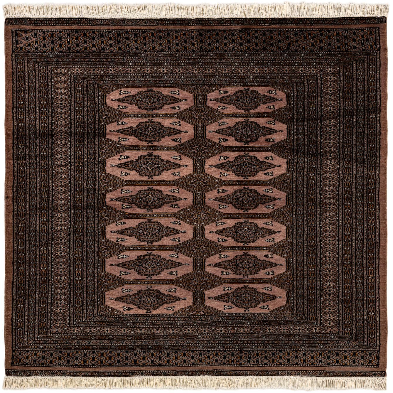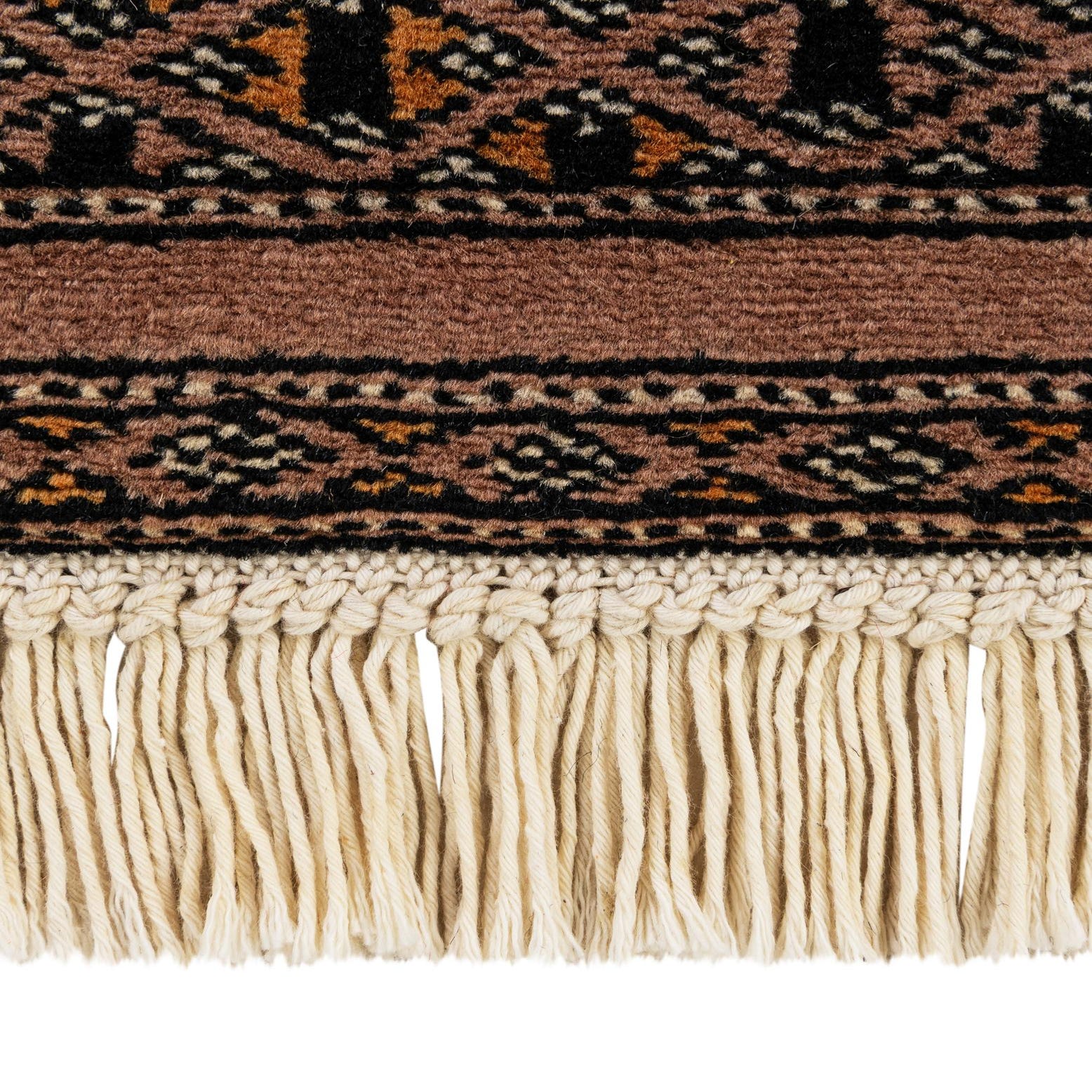 A 4x6 rectangular Bokhara rug featuring a traditional tribal pattern in shades of brown and tan, with fringe.