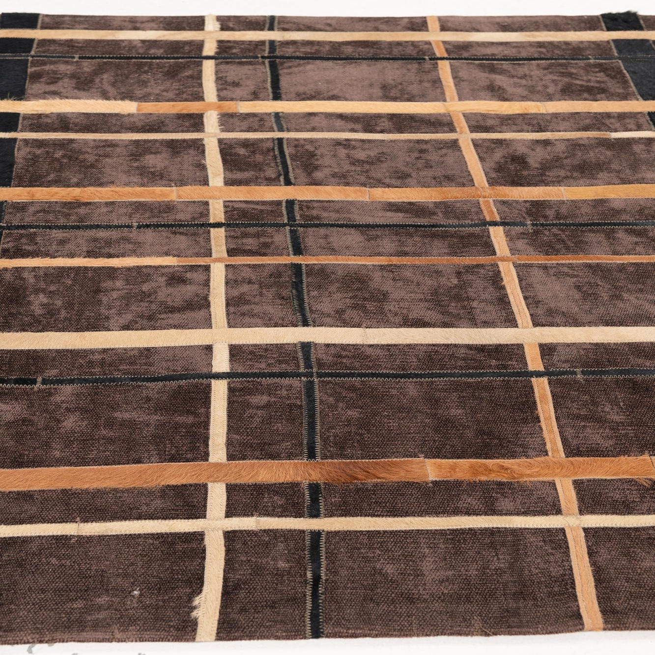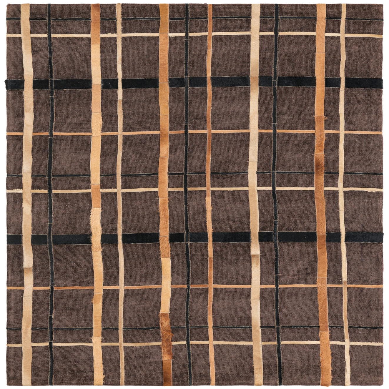 A 4x6 rectangular Cowhide Leather rug featuring a modern abstract plaid pattern in varying shades of brown and tan.
