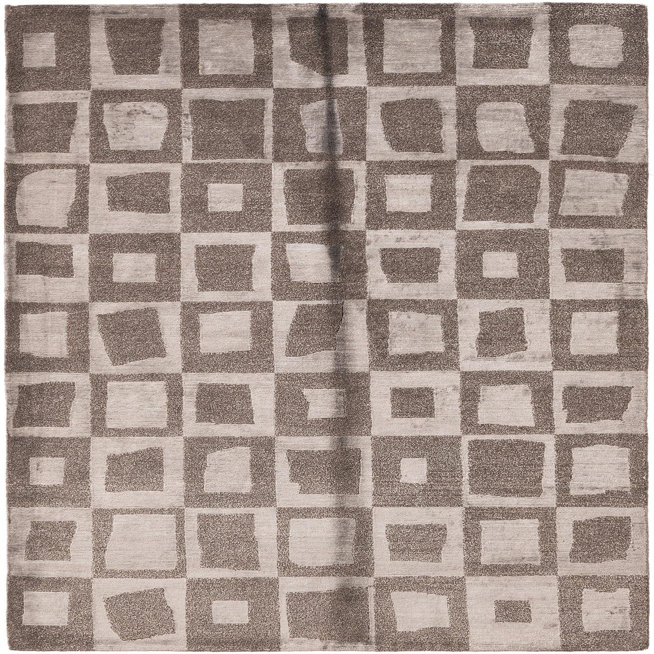 Handmade of wool and cotton, this rug presents a contemporary grid of irregular squares on a warm brown background. Gray blocks and inset shapes interrupt the grid with a hand-drawn quality, giving the design a relaxed geometric rhythm. The woven construction creates gentle pile variation: the wool areas have a soft, tactile lift while the cotton sections lie flatter, so the surface invites touch and adds subtle textural depth to the floor.