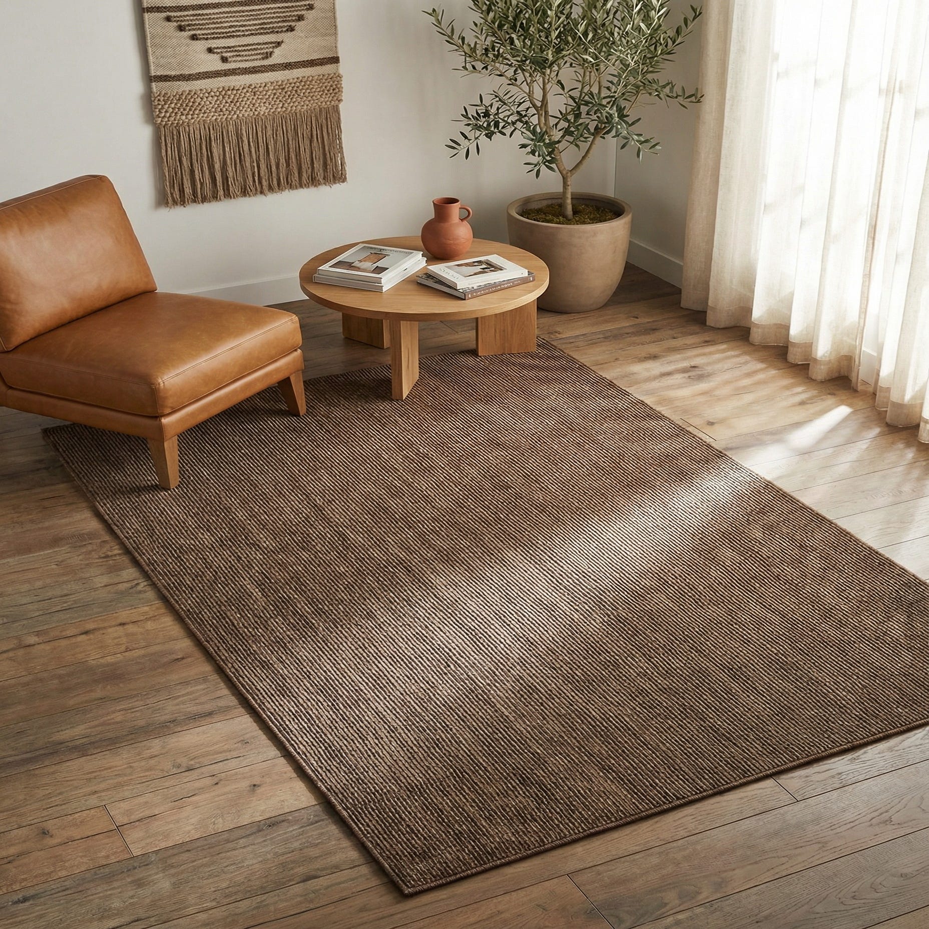 This rug works well as an anchoring piece in a warm, contemporary living room beneath a sofa and coffee table, or layered at the foot of a bed to add tactile comfort. It pairs naturally with warm wood tones, leather seating, and neutral upholstery, and also complements mid-century and transitional schemes that favor clean lines and muted palettes. Use it in a home office to soften a workspace or in a den where understated texture is preferred over bold pattern.