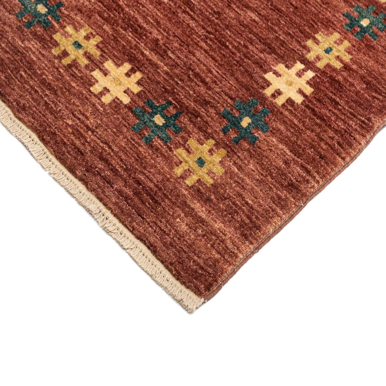 The Gabbeh collection presents a hand-made 4x6 rug crafted from 100% wool, offering a rich, tactile experience underfoot. This piece showcases a warm brown backdrop that lends a grounding effect to the space it occupies. The design involves a linear border pattern featuring a selection of secondary colors, including cream, blue, and beige, which provide a visually harmonious contrast.