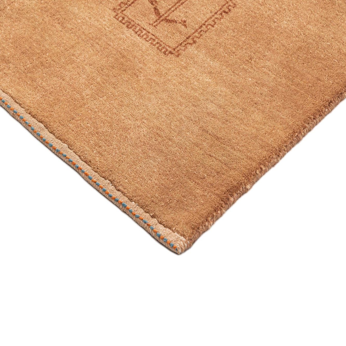 A 4x6 rectangular Gabbeh rug in warm brown and tan, featuring a modern pattern of small, dark geometric and abstract motifs in squares.