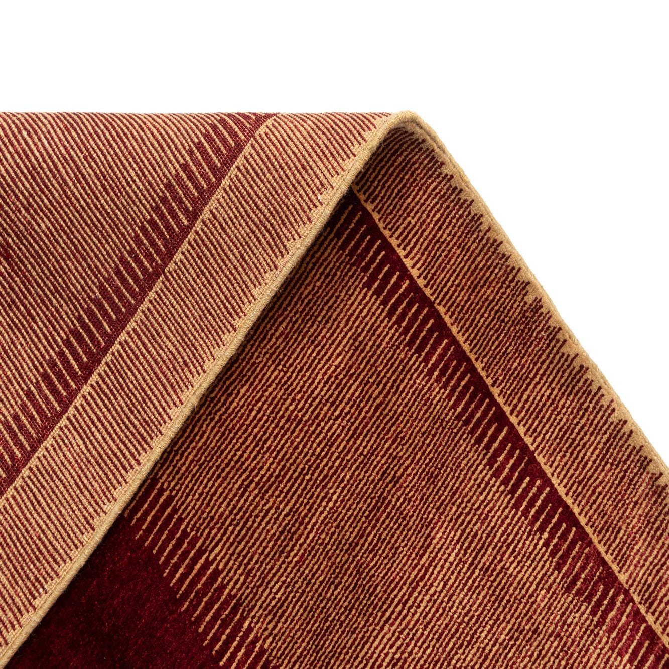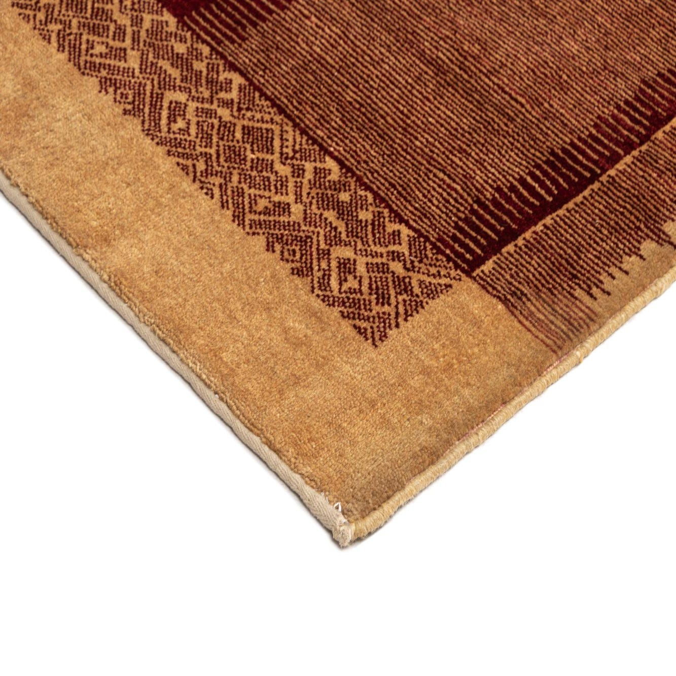 The Juma Collection rug is a handcrafted piece measuring 4x6, woven with 100% wool, which provides a natural texture that is durable and plush. Its pattern exhibits a simple yet sophisticated aesthetic, characterized by a deep burgundy central panel flanked by lighter brown stripes and bordered by a warm brown edge. The design includes a subtle geometric motif along the borders, adding an element of intricacy to its otherwise minimalist appearance.