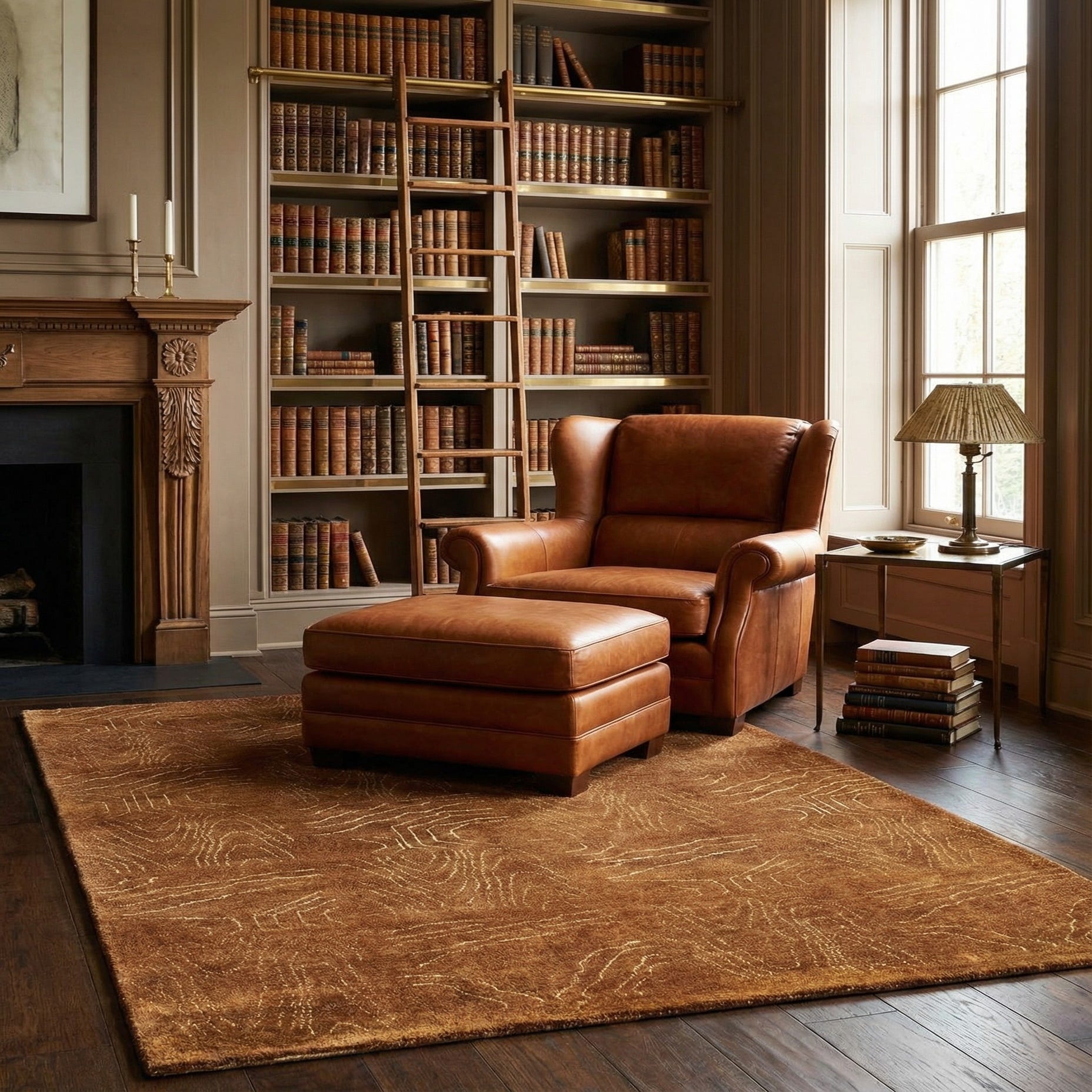 A 4x6 rectangular brown wool rug with a subtle tan Persian pattern, suitable for various indoor rooms.