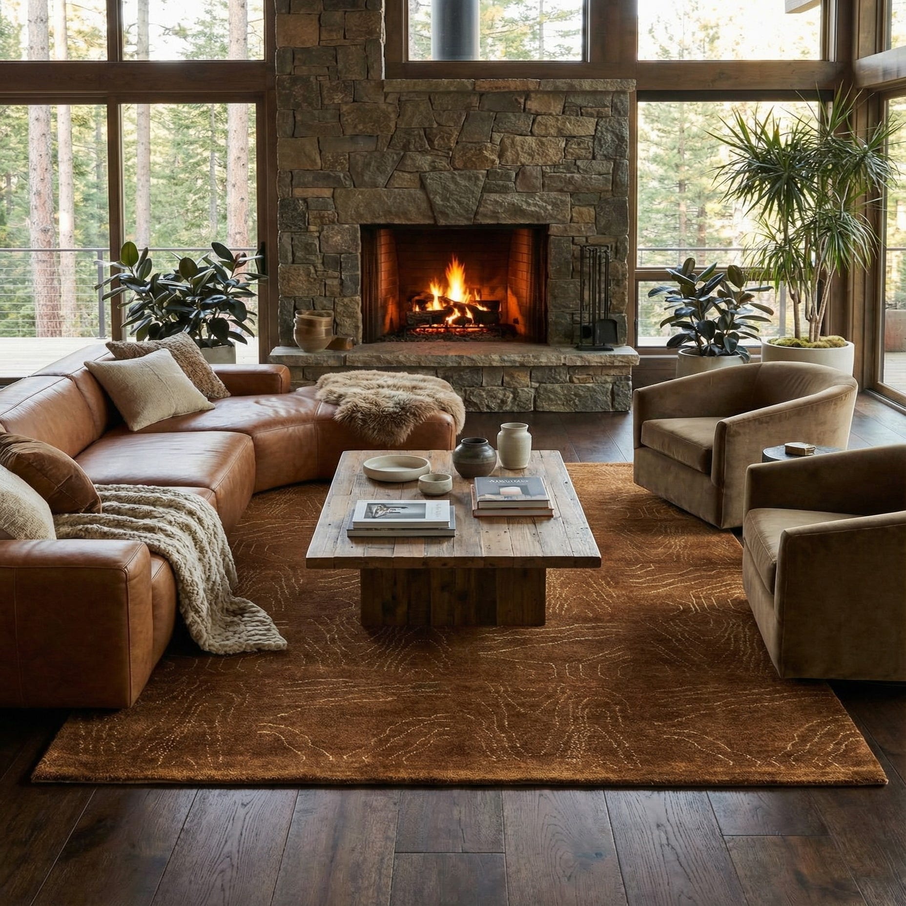 The rug's texture adds a tactile dimension to its visual appeal. Its plush wool construction not only provides comfort underfoot but also lends the piece a natural, organic feeling.