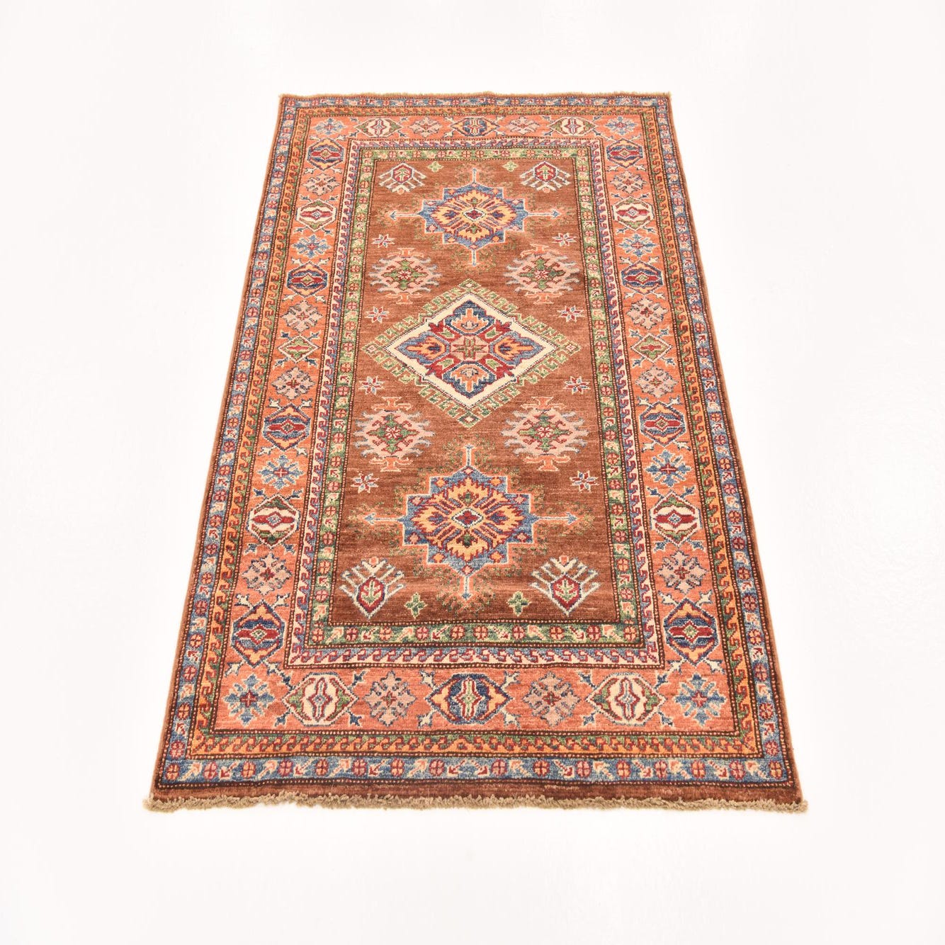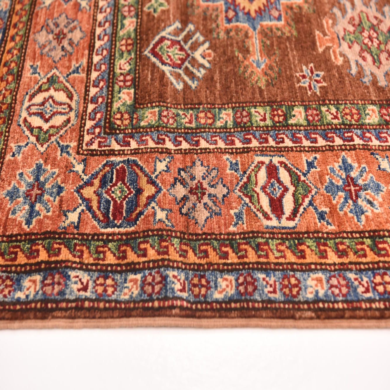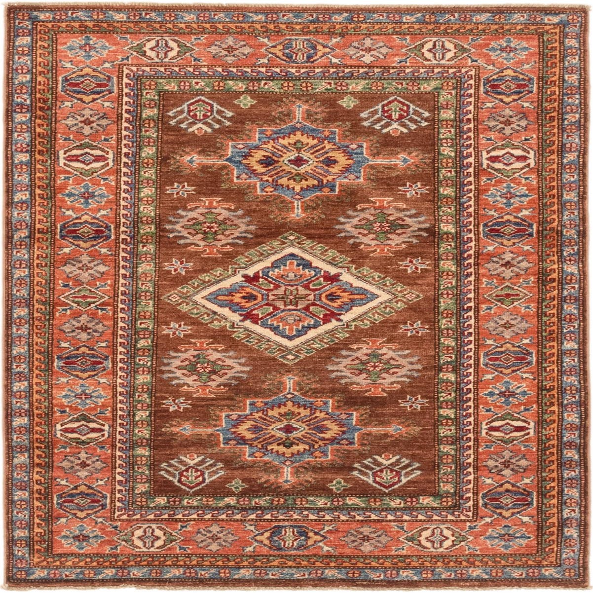 A 4x6 rectangular brown Kazak rug with traditional Southwestern and Oriental patterns in blues, reds, and creams.