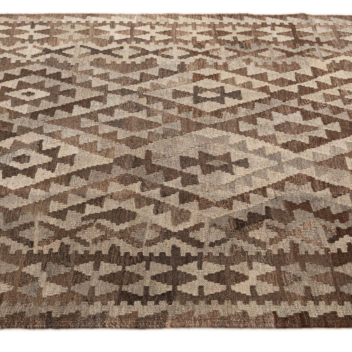A 4x6 rectangular Kilim Maymana rug featuring a tribal geometric pattern in varying shades of brown and tan.