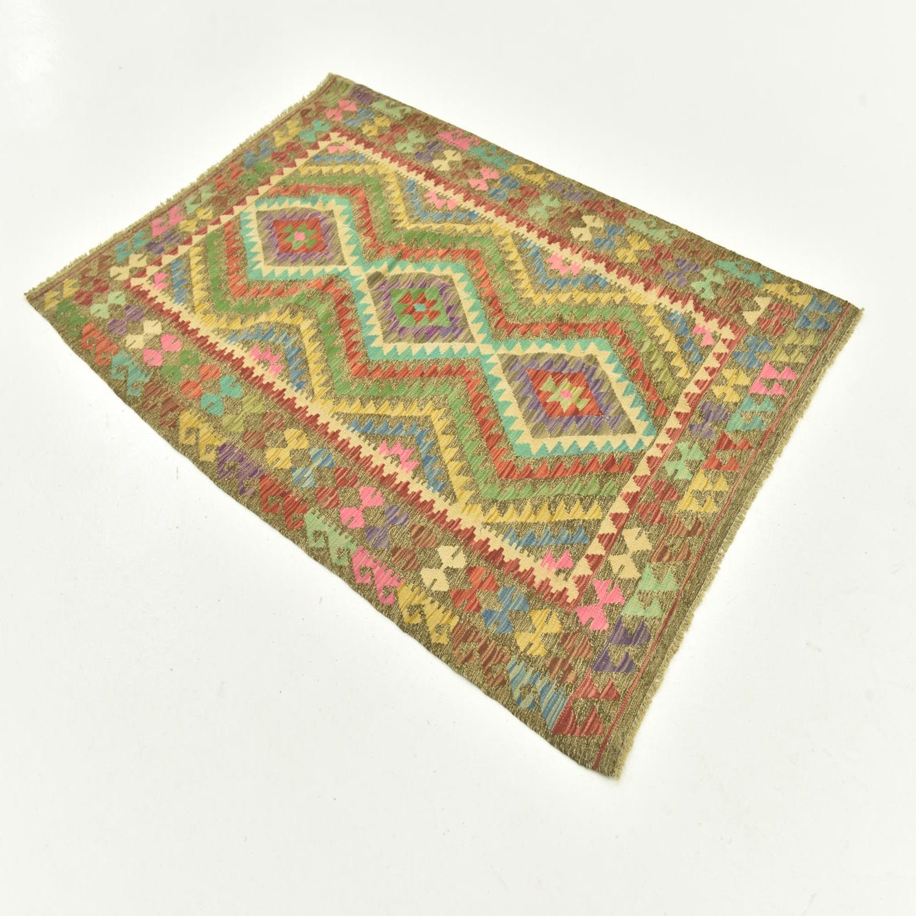 The Kilim Maymana rug, measuring 4x6 feet, is a testament to the enduring craftsmanship of hand-woven textiles. Crafted from 100% wool, this rug presents a rich palette of colors, including brown, beige, blue, green, purple, red, yellow, pink, and light brown, with the brown background providing a grounded base for the vibrant hues to stand out. Its traditional kilim design is characterized by a symmetrical pattern that displays geometric motifs and a distinctive diamond centerpiece, creating a dynamic visual effect.