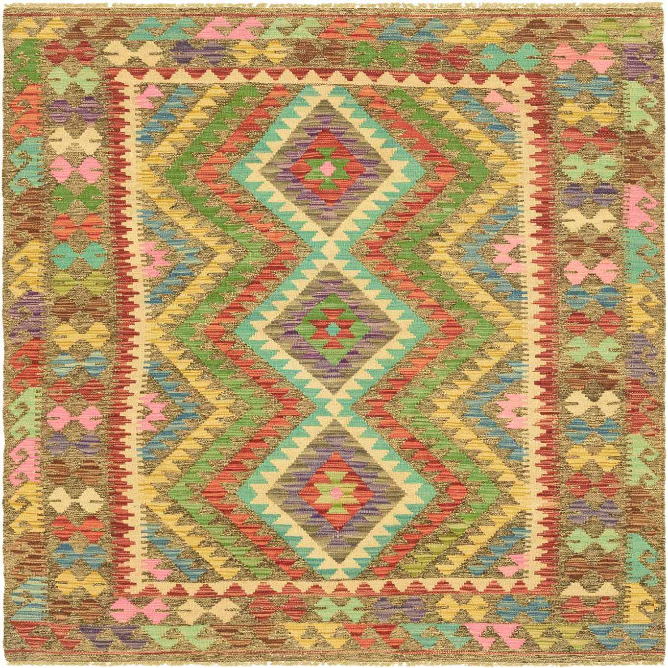 Primary color is Brown. Colors in this rug include: Brown, Beige, Blue, Green, Purple, Red, Yellow, Pink, Light Brown.