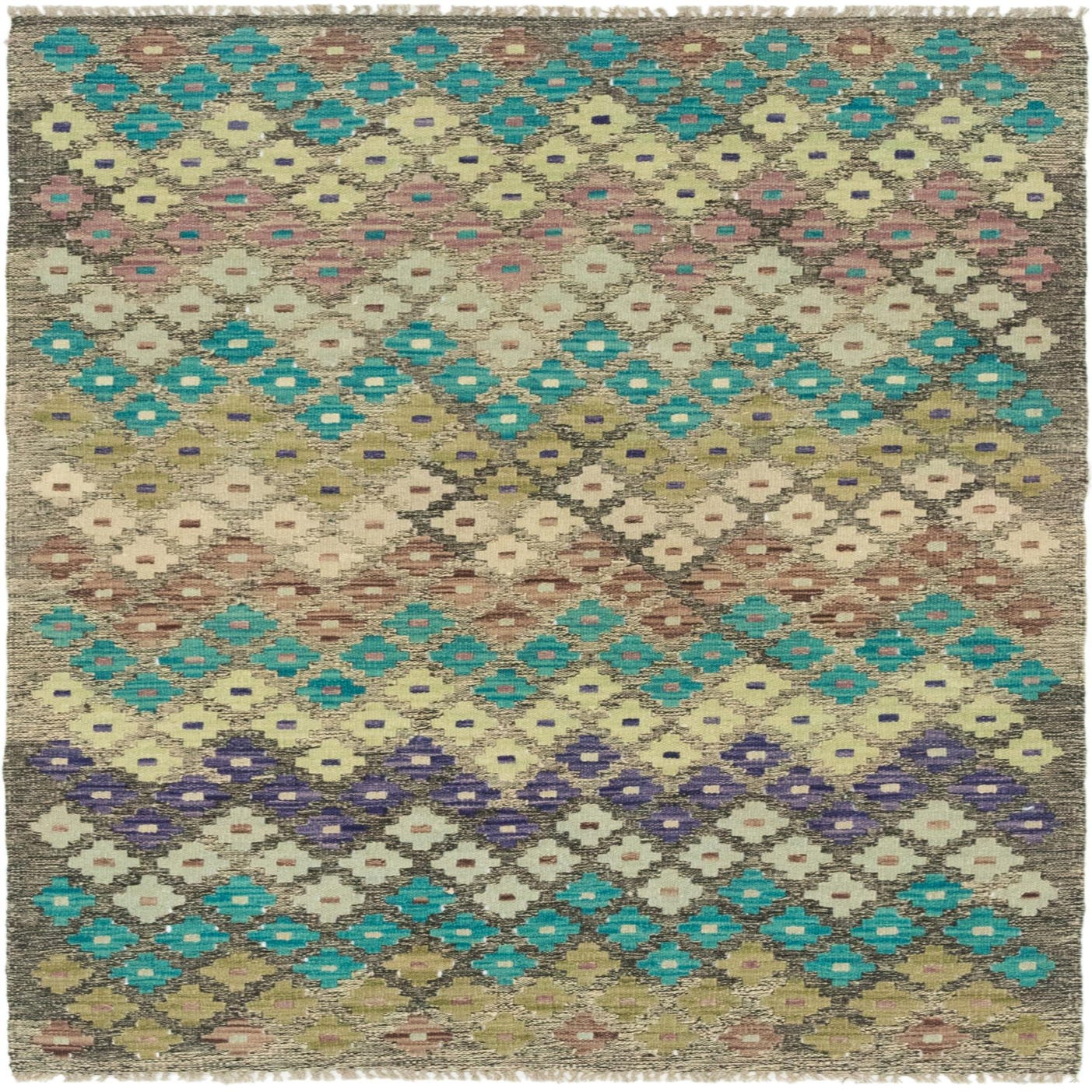 A 4x6 rectangular Kilim Modern rug with a Southwestern tribal pattern in various shades of brown, tan, teal, purple, and green.