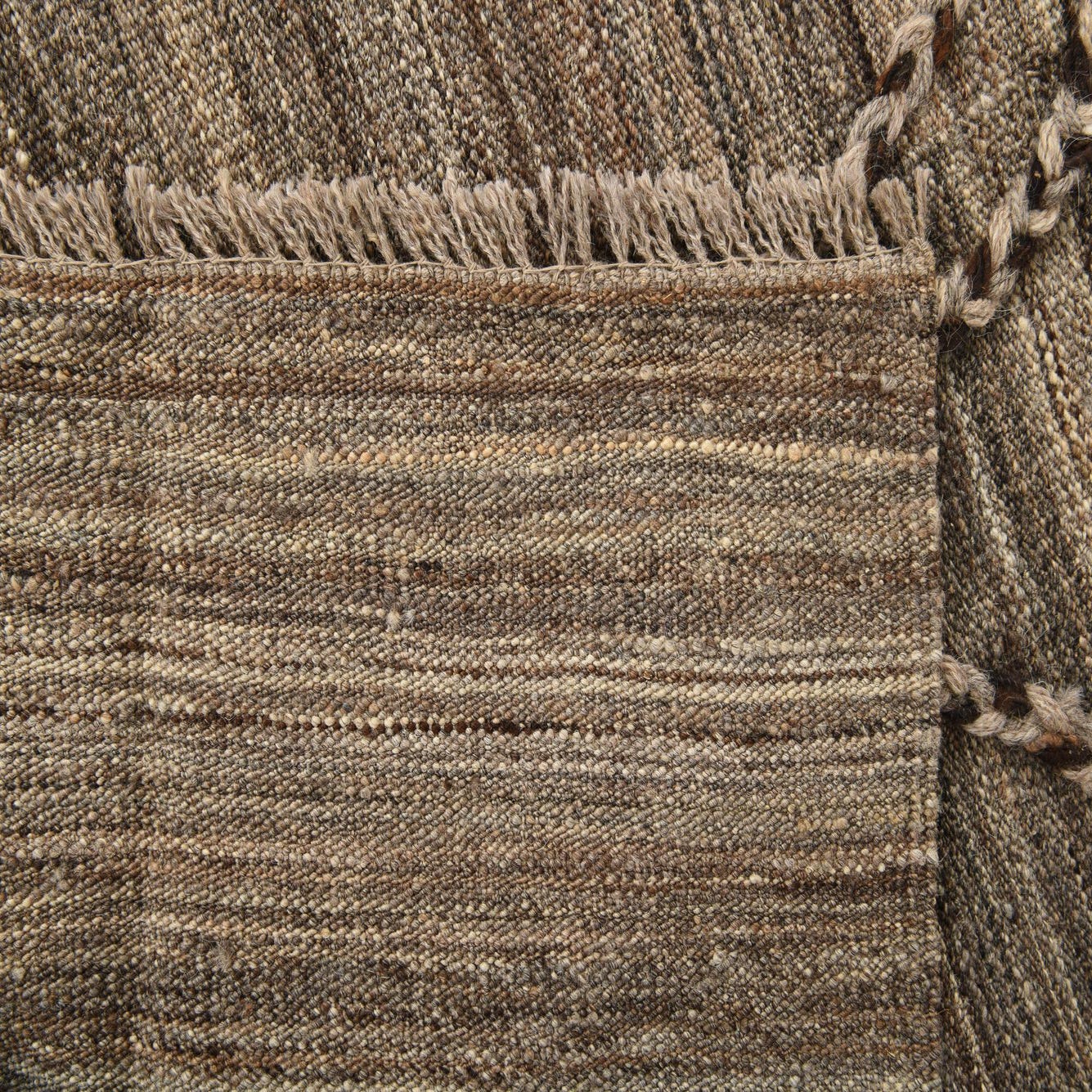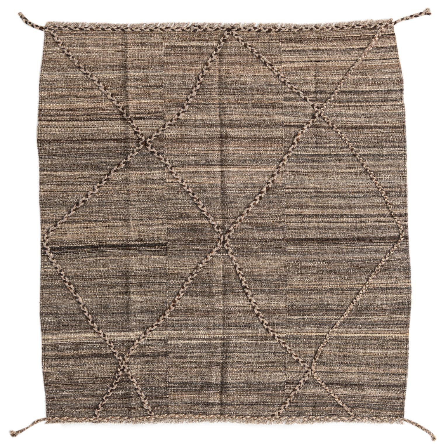The Kilim Modern collection presents a hand-woven 100% wool rug in a versatile 4x6 size, catering to a variety of spaces. This rug exhibits a simple yet impactful geometric pattern, characterized by a series of intersecting diamond shapes, providing a sense of rhythm and visual interest to the piece. The main color palette includes a warm brown background complemented by lighter brown accents, conveying earthy tones that lend a natural and inviting aesthetic.