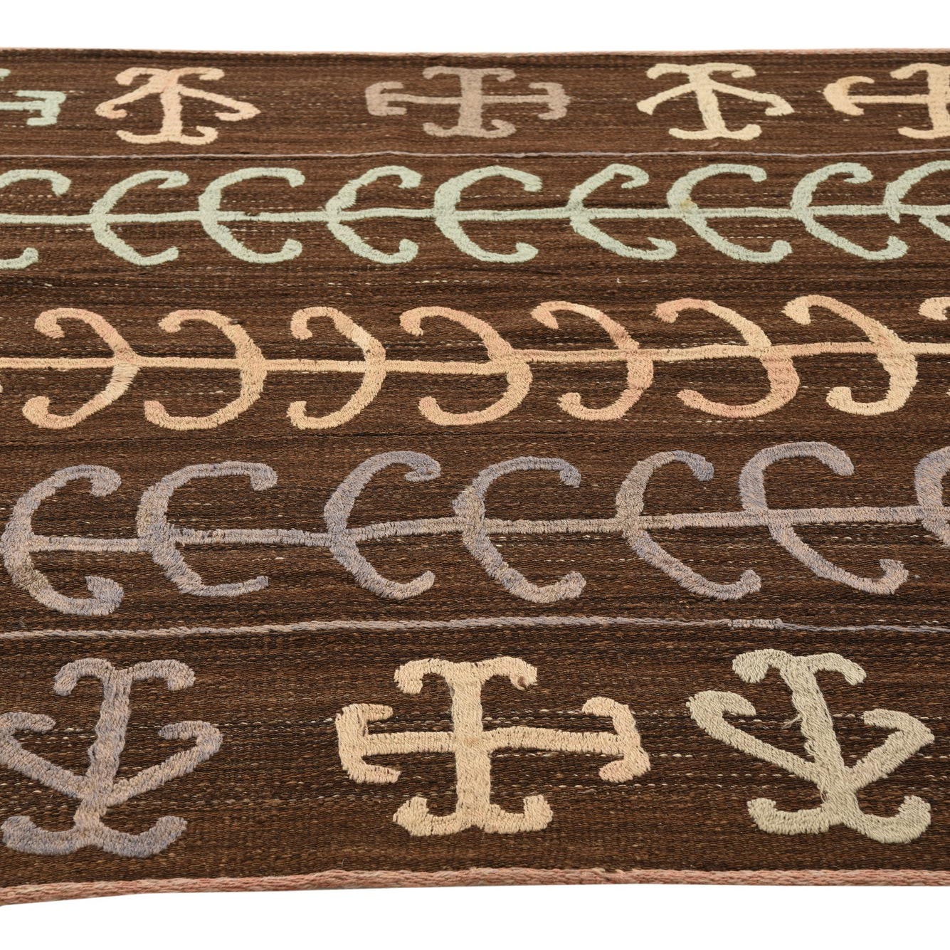 A 4x6 rectangular Kilim Suzani rug featuring a dark brown background with tribal, abstract patterns in light blue, purple, and tan.