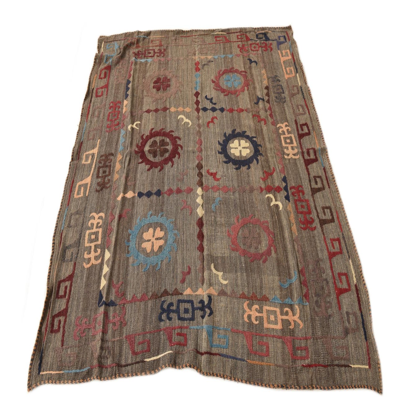 A 4x6 rectangular brown flatweave rug with a colorful tribal Suzani pattern, featuring abstract medallions and geometric borders.
