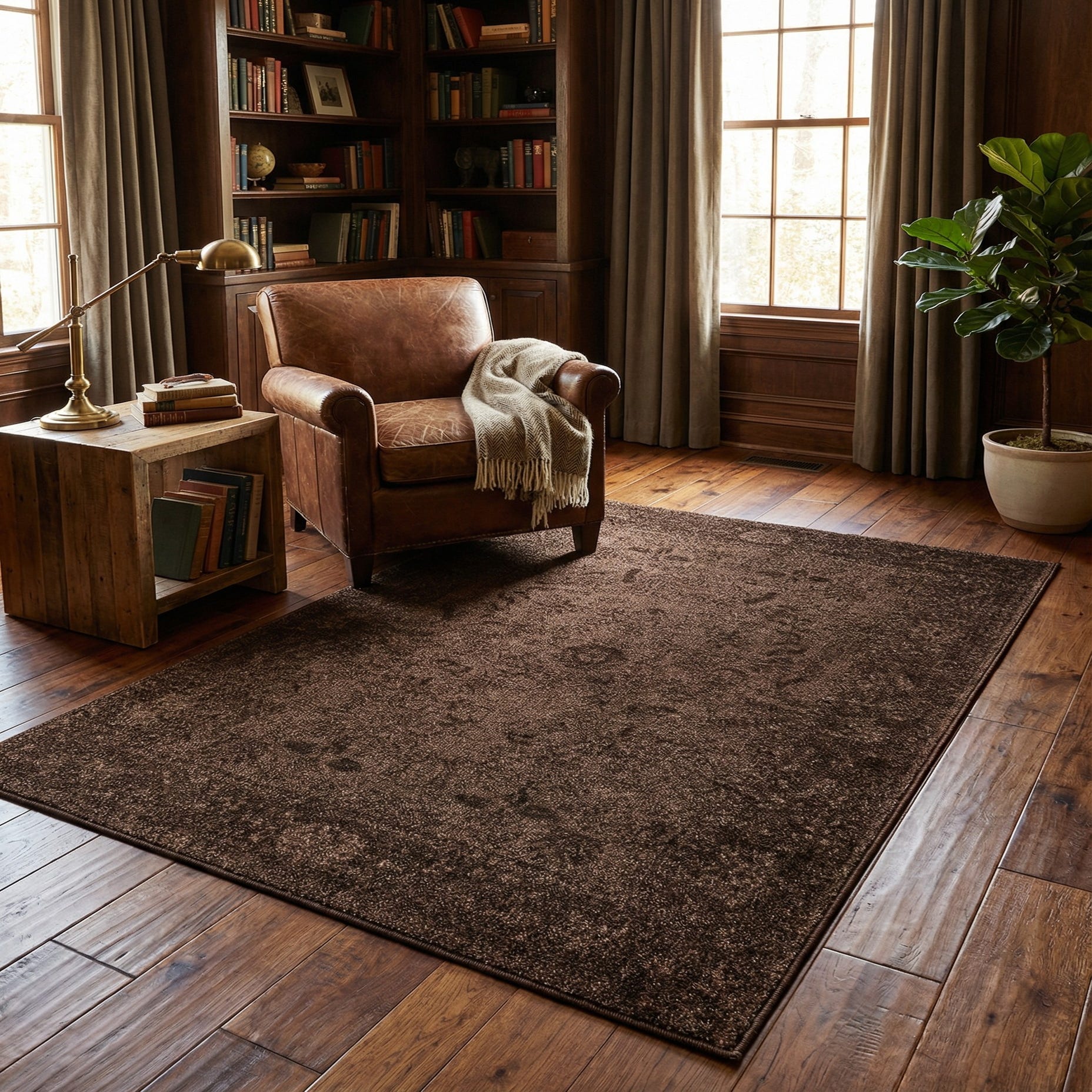 Warm brown forms the backdrop for a softly detailed, tonal pattern in beige. A deeper brown border frames the center field where a subtle floral and medallion motif unfolds, giving the rug a refined, lived-in character without strong contrast. The result is a classic, understated look that brings depth and warmth to a room while remaining visually calm.