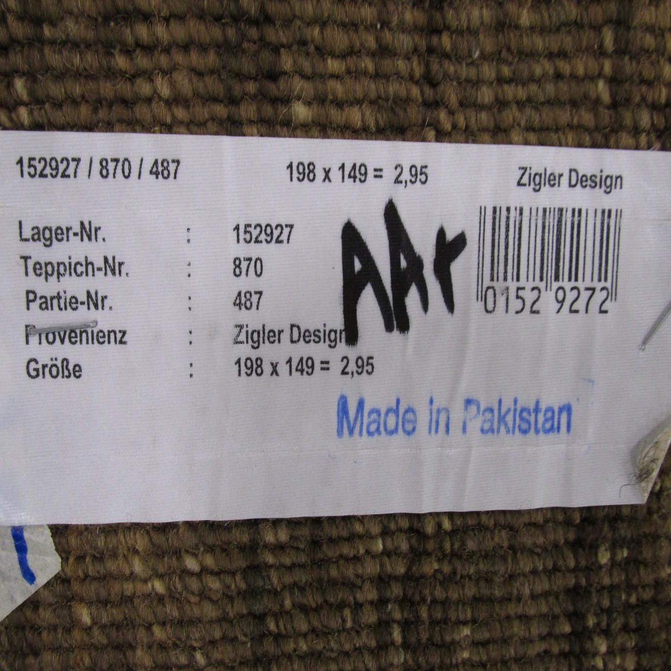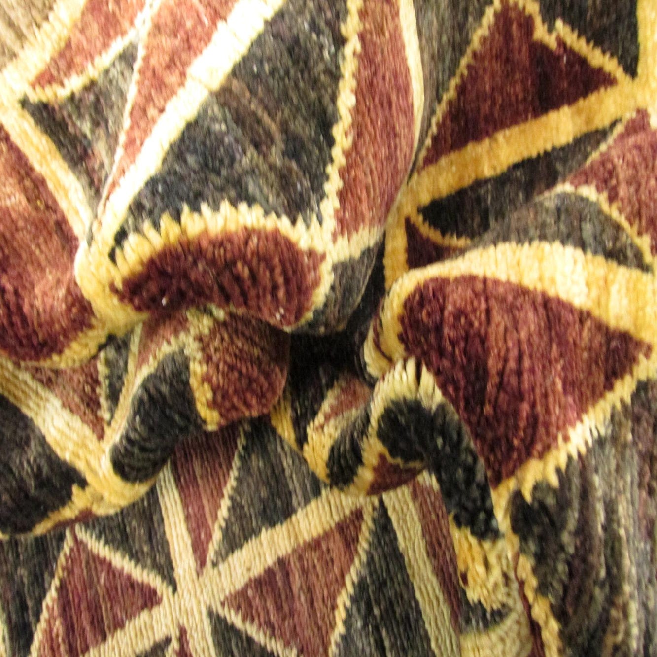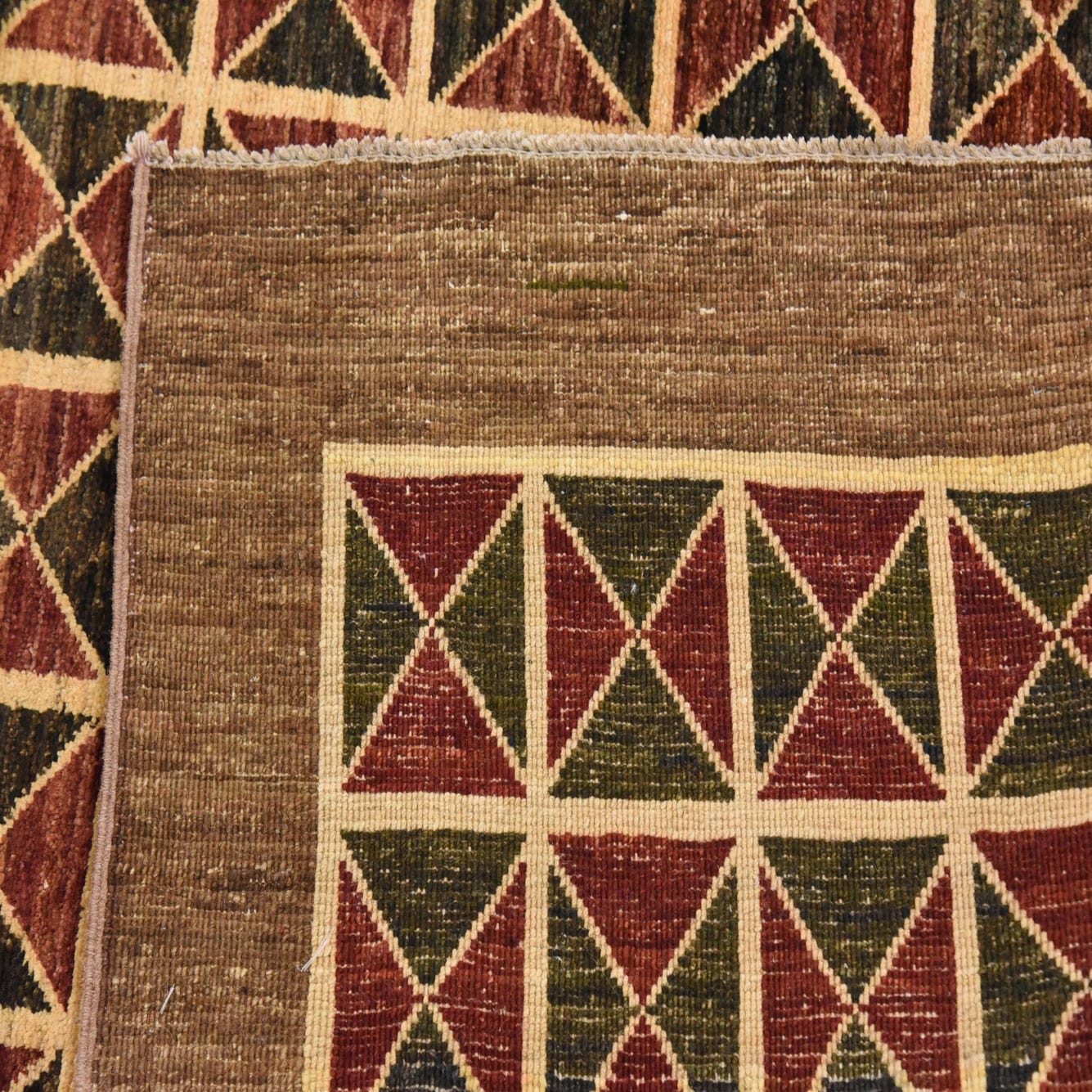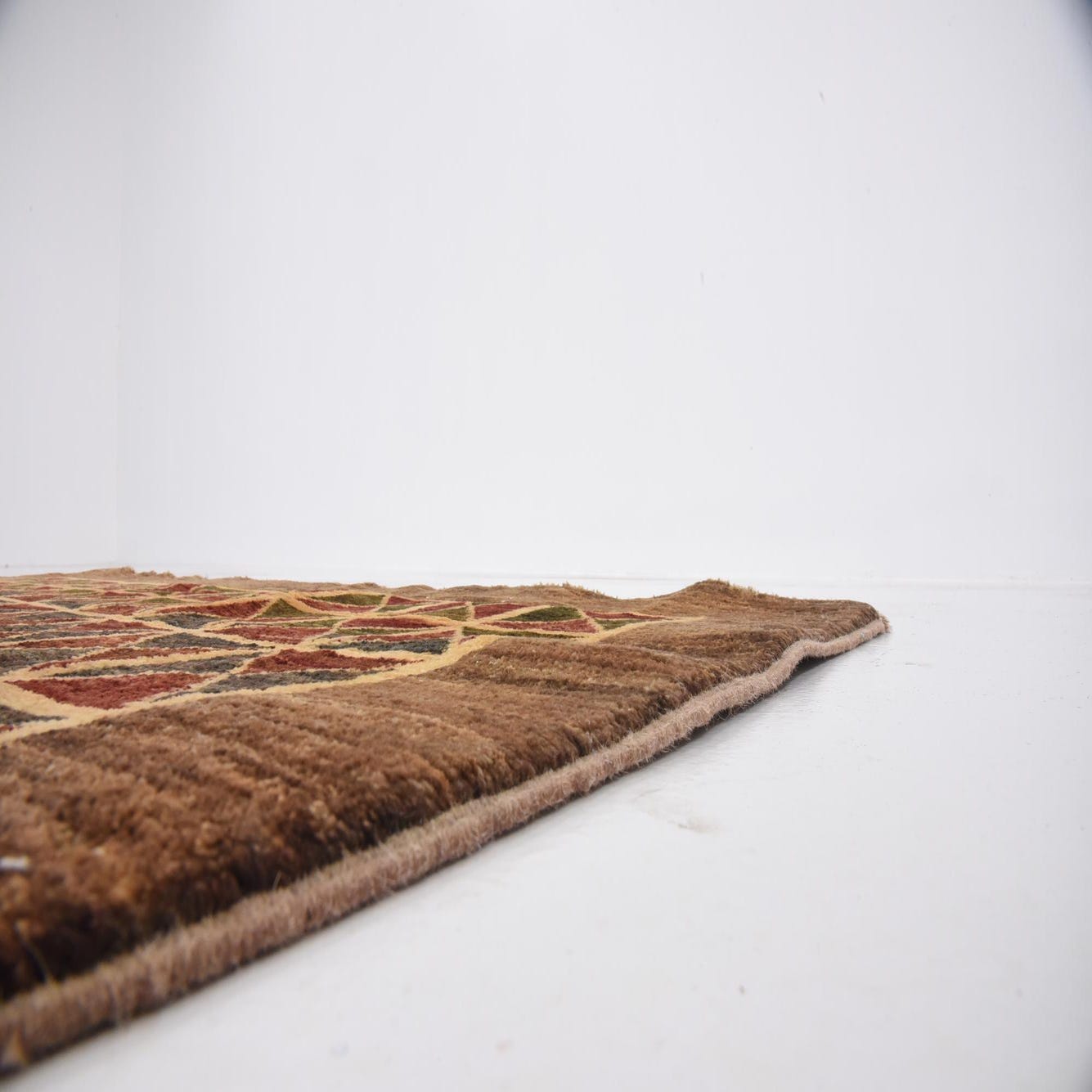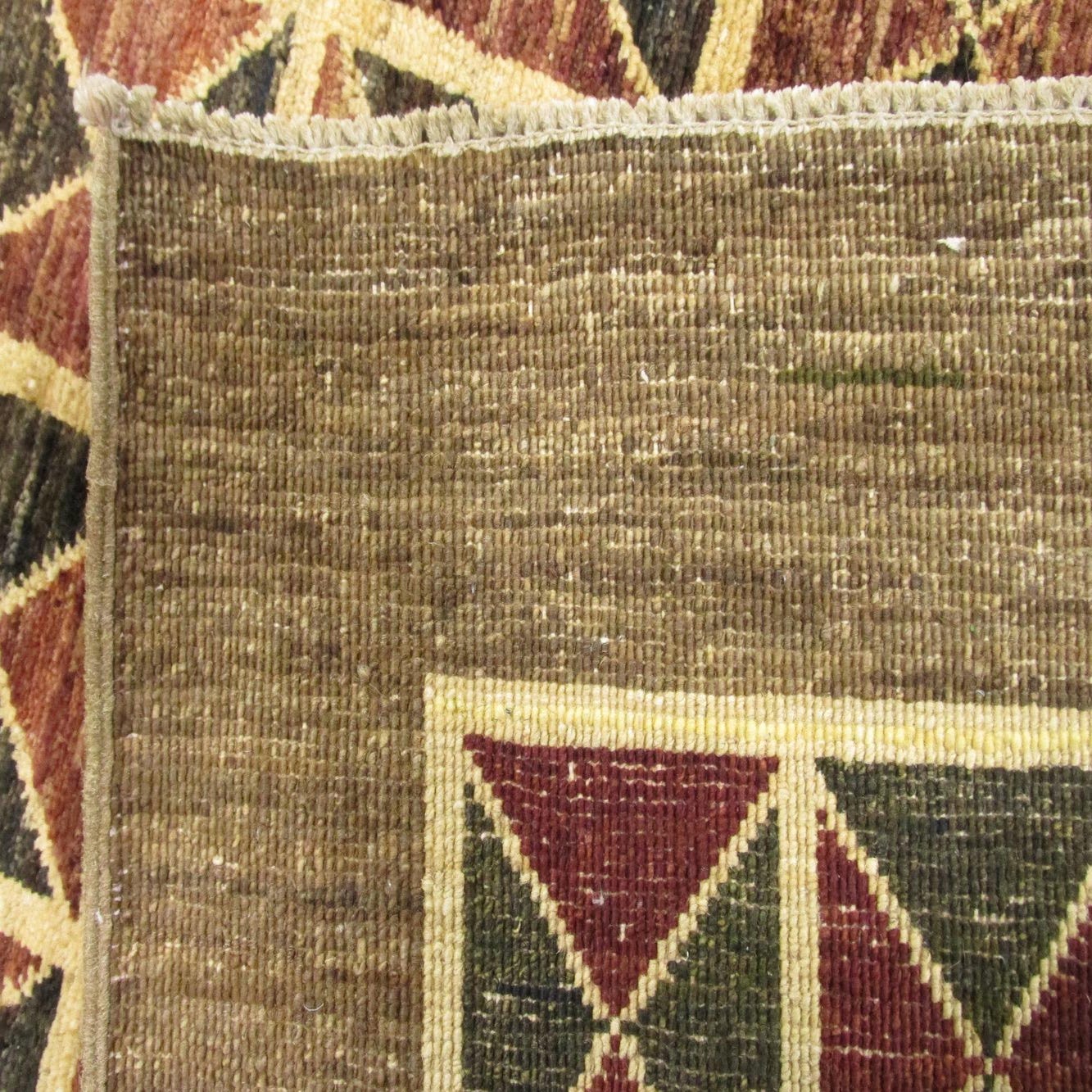 This Modern Ziegler rug is hand-knotted from 100% hand-spun wool, offering a balance of durability and tactile pleasure. The brown background creates a warm base for the rust red, cream, black, and green accents. This 4x6 rug displays an understated yet compelling pattern featuring geometric shapes arranged in a symmetrical grid, adding visual interest without overwhelming a space.