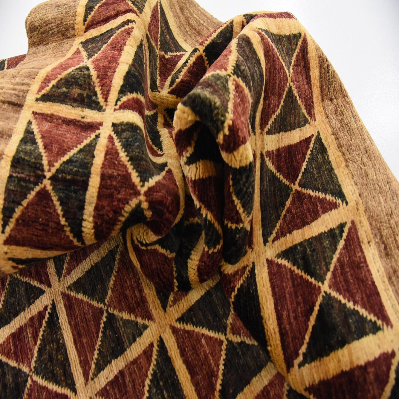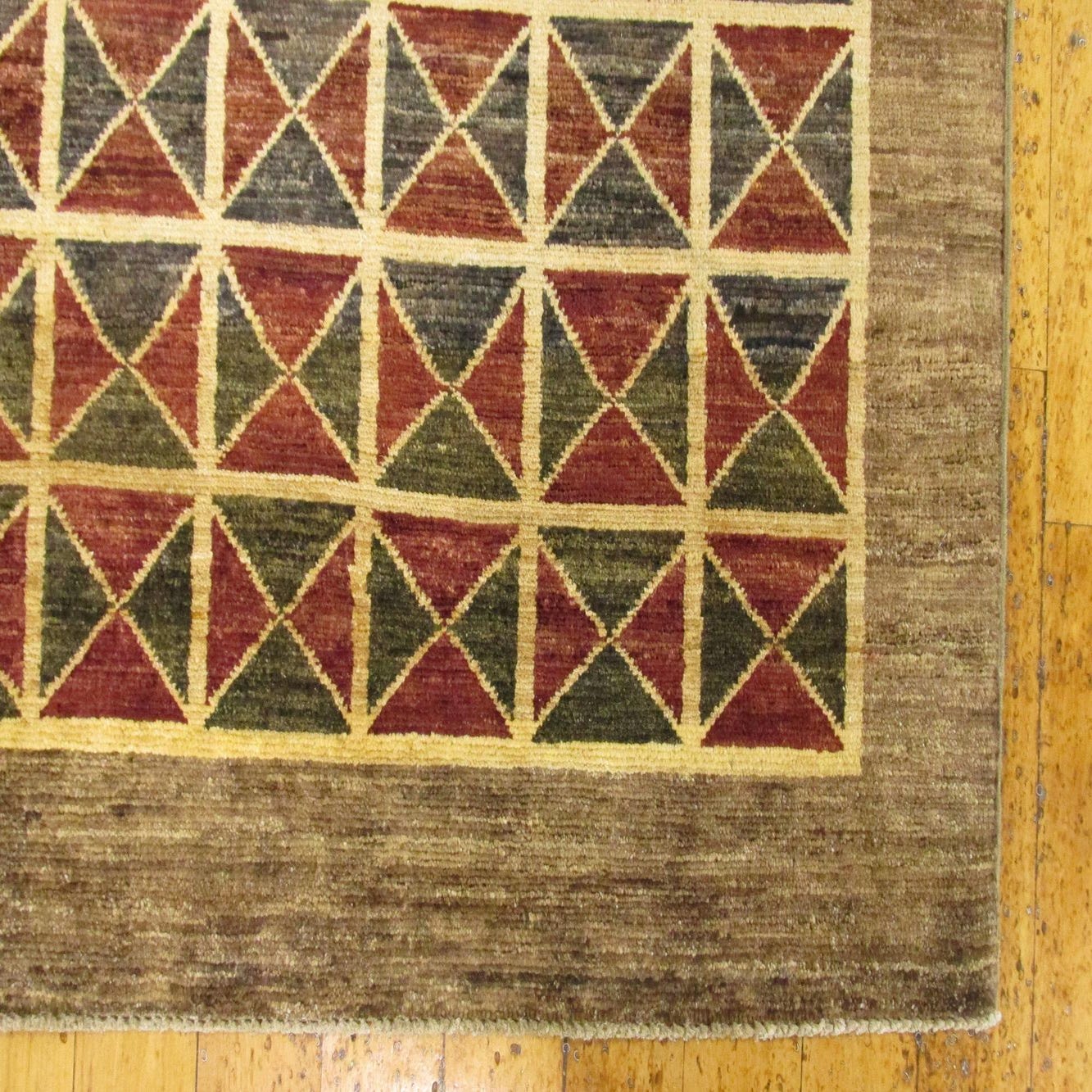 A 4x6 rectangular Modern Ziegler rug featuring a grid of squares, each divided into four triangles in shades of brown, tan, and dark red, with a solid brown border.