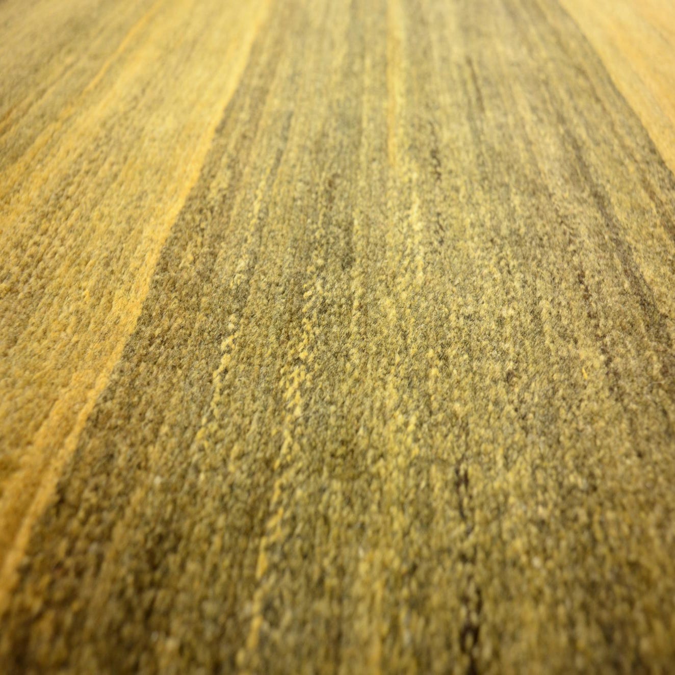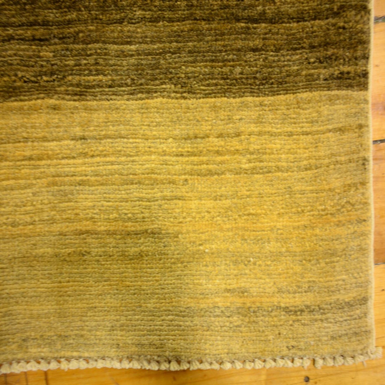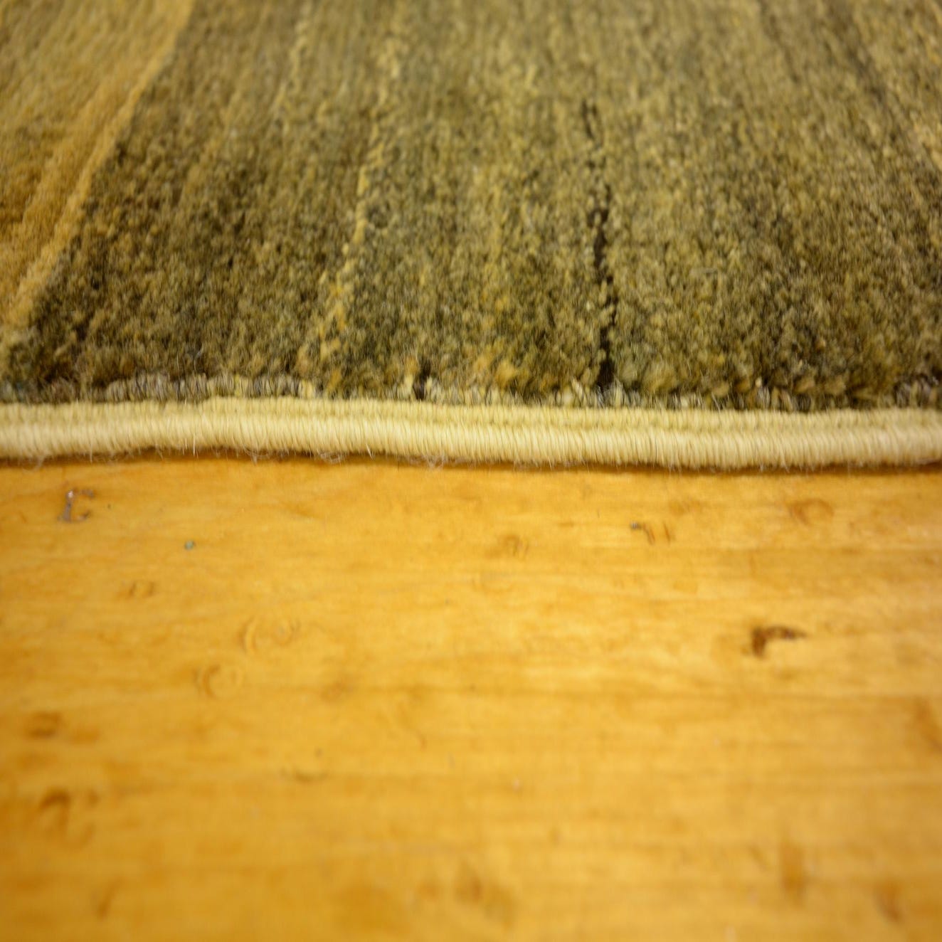 The soft texture and subtle color variations within the stripes add depth and visual interest to the rug, suggesting it has been created with attention to detail and artisanal skill. The addition of fringe on the shorter ends gives the piece a traditional edge, linking it to the timeless appeal of hand-knotted rugs.