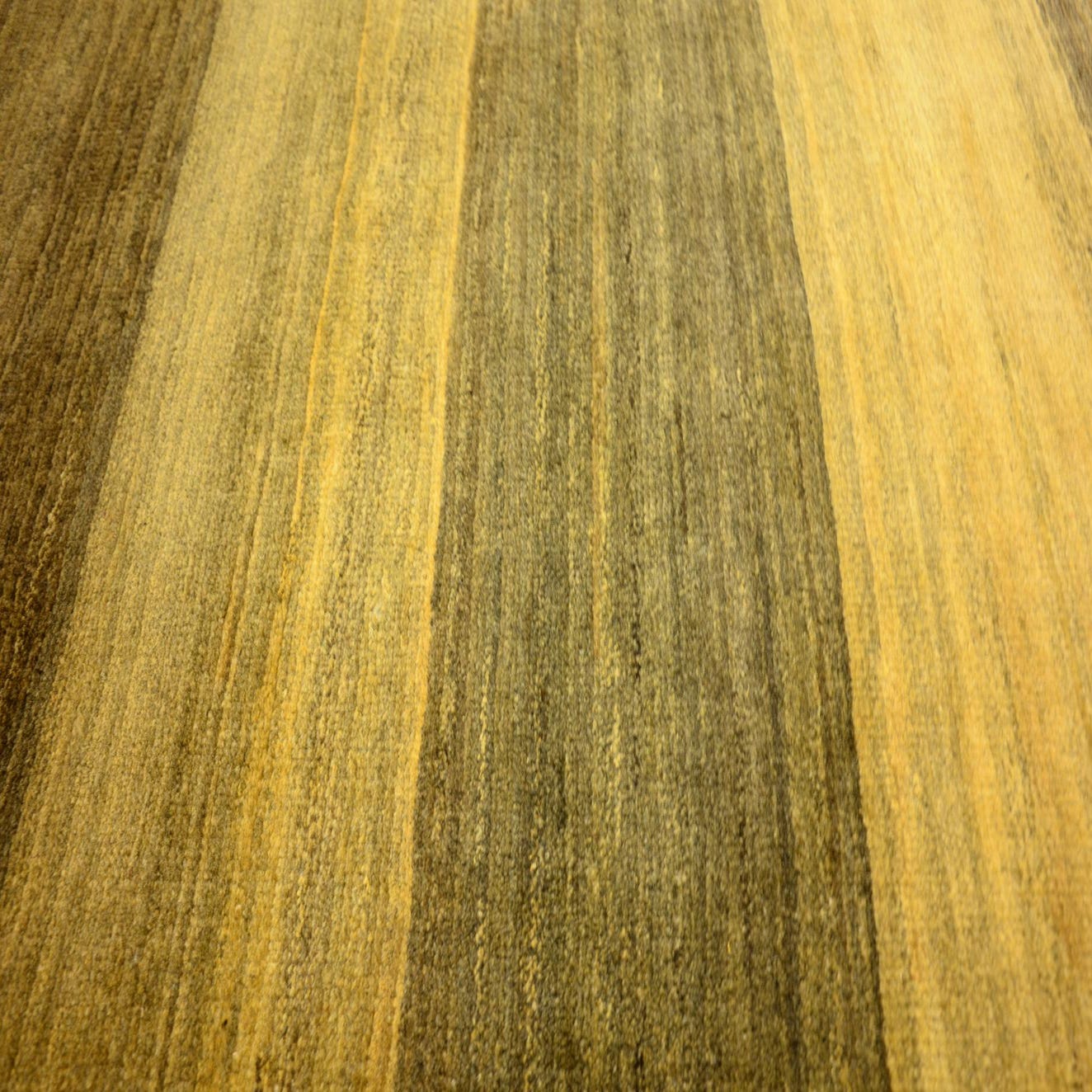 This Modern Ziegler rug, measuring 4x6 feet, is crafted from 100% hand-spun wool and showcases a hand-knotted construction, offering both durability and texture. The rug features a contemporary take on a classic striped pattern, consisting of horizontal bands that alternate in shades of brown, gold, and light brown. The background tone is a warm brown that provides a grounding base for the various stripes.