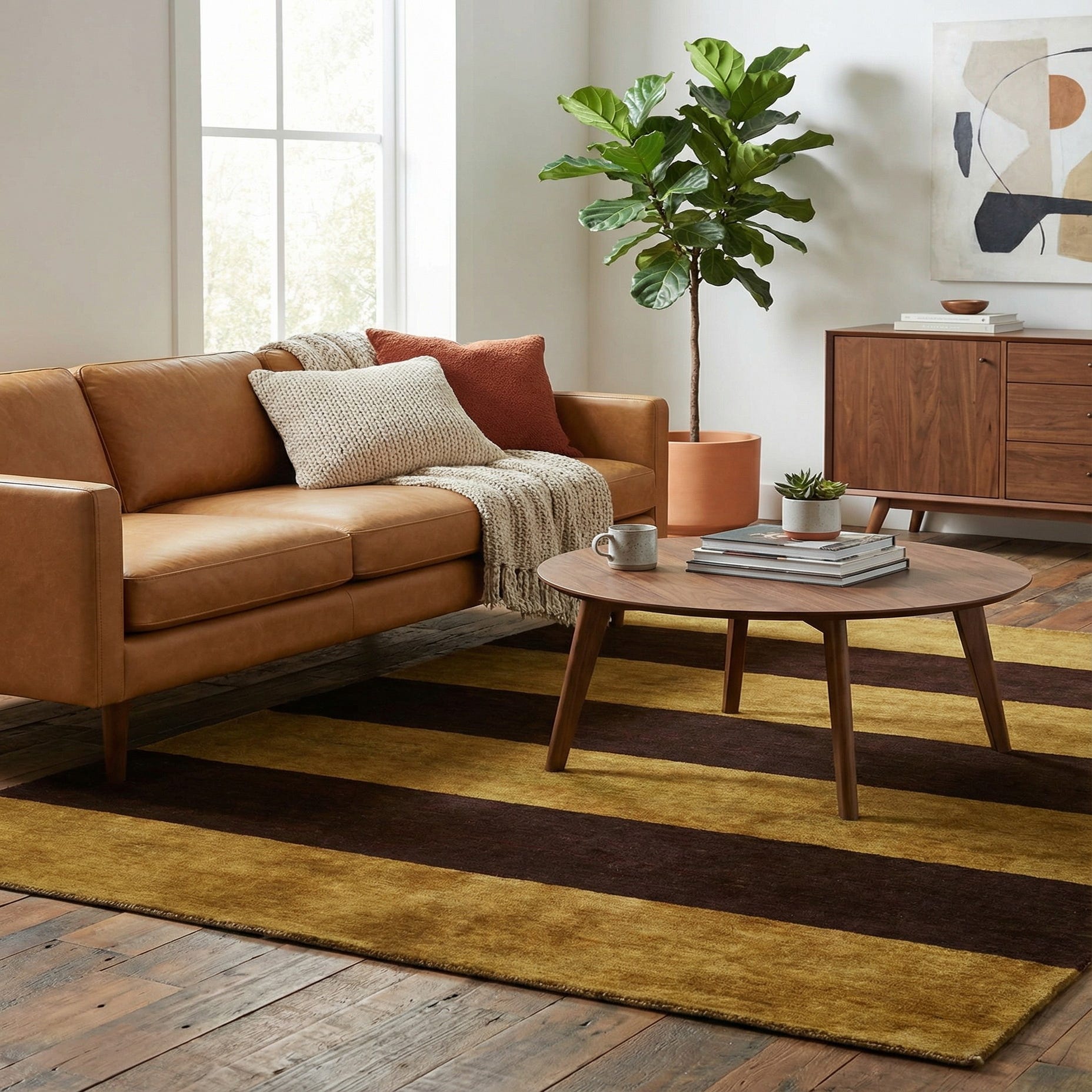 The Modern Ziegler collection presents a timeless design with its 4x6 hand knotted rug, crafted from 100% Hand Spun Wool for a durable and luxurious feel. This particular piece features a bold striped pattern alternating between deep brown and tan hues, creating a sense of structure and sophistication. The background color is a warm, inviting brown, framed with a subtle fringe that adds an element of traditional craftsmanship.