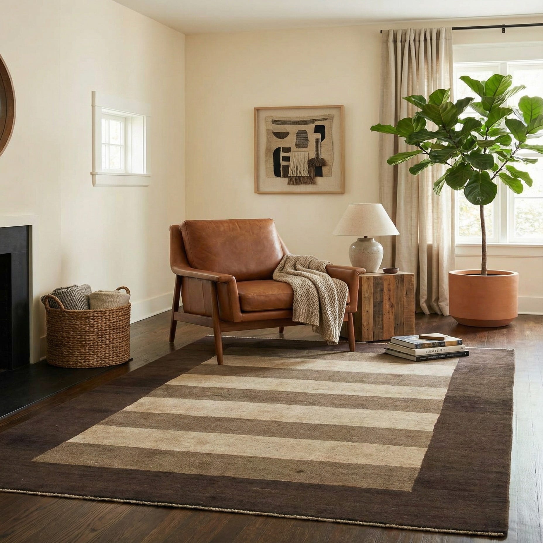 The texture, inherent to the hand-spun wool, adds depth and tactile appeal to the rug, while the fringe on each end introduces a traditional touch, nodding to the craftsmanship behind this piece. The simplicity of its striped pattern and the earthy tones make this rug an excellent candidate for a variety of interior design scenarios.