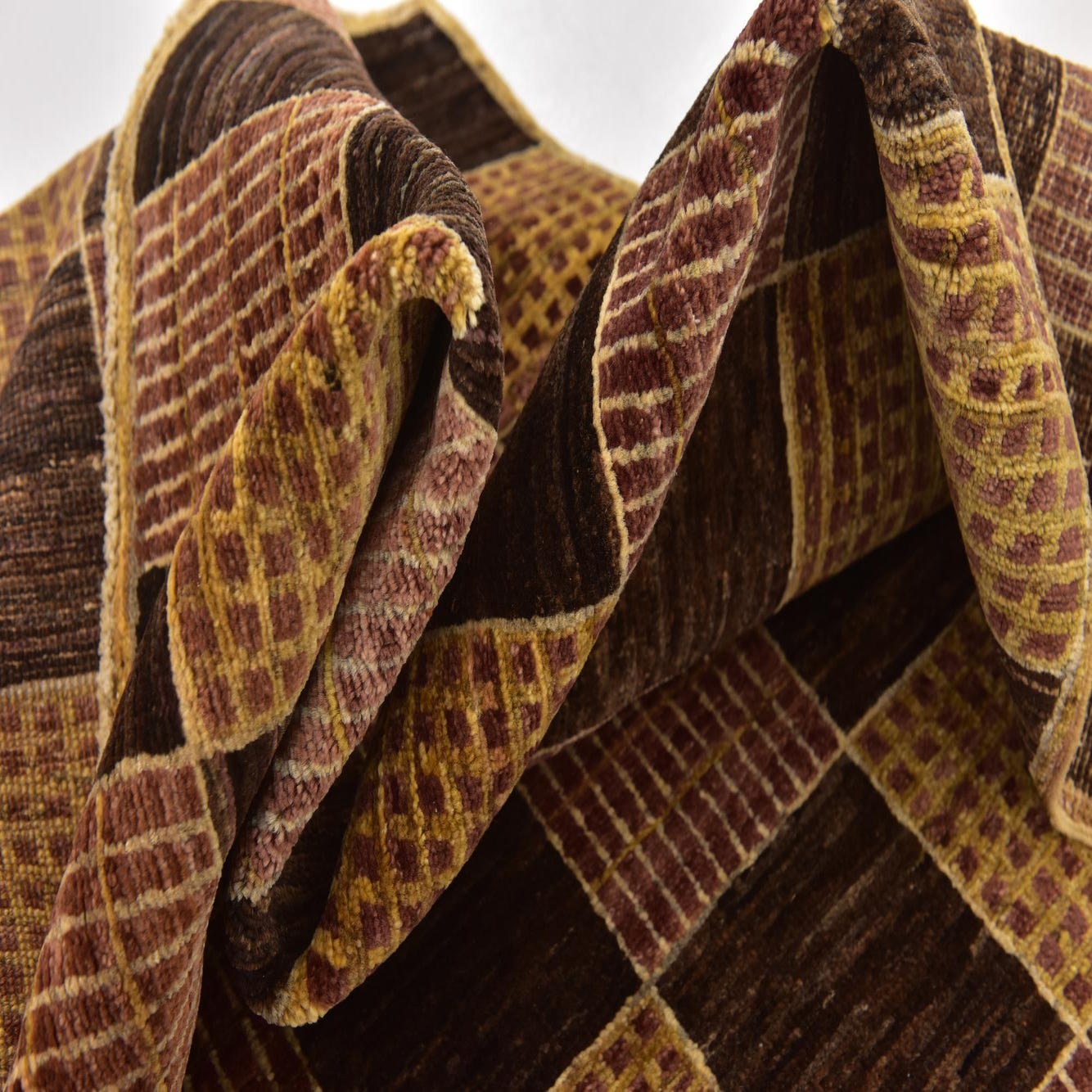 The Modern Ziegler rug is a 4x6 hand-knotted piece, expertly crafted from 100% hand-spun wool, ensuring both durability and a soft touch underfoot. This rug features a compelling checkerboard pattern, presenting a bold yet harmonious blend of brown, cream, and rust red hues. The background is predominantly brown, providing a rich canvas upon which the cream and rust red squares draw the eye, giving it a distinct and modern appeal.