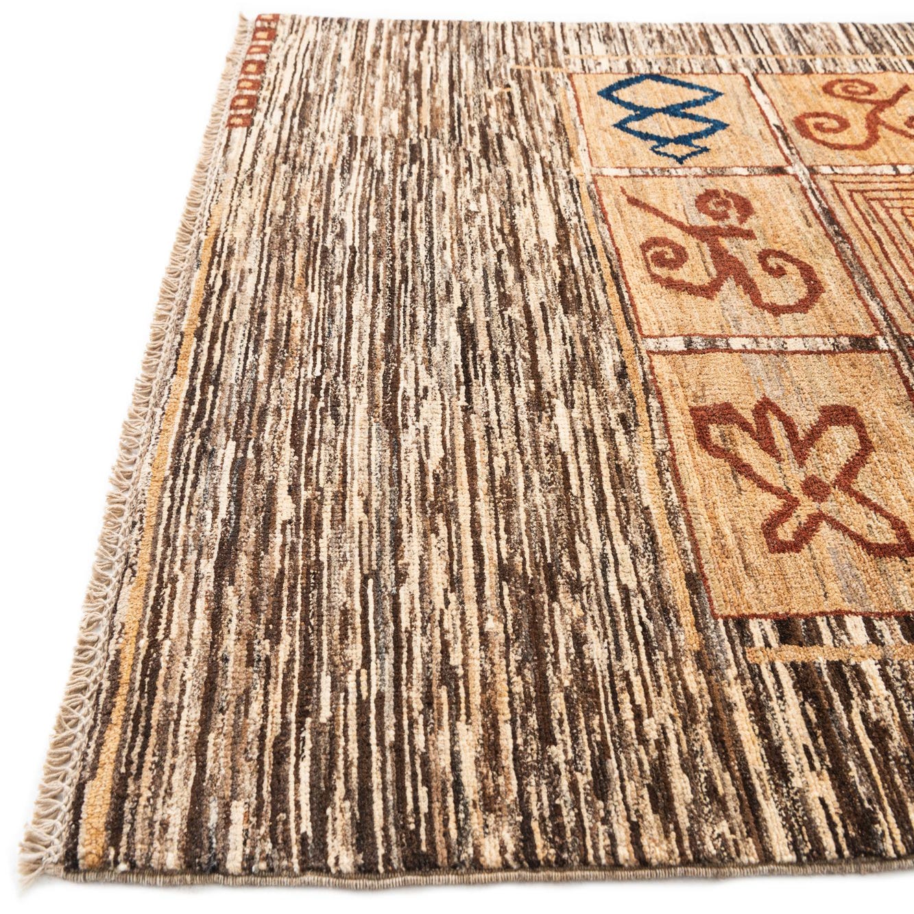 This 4x6 Modern Ziegler rug presents a harmonious mix of traditional motifs and contemporary design sensibilities. Hand-knotted from 100% wool, the rug offers a pleasing texture that is both tactile and visually inviting. The pattern consists of a rich tableau of brown, beige, light brown, ivory, and navy blue colors, set against a predominantly brown background that anchors the piece with an earthy depth. The display of geometric shapes and symbols adds a touch of tribal influence to the rug, while the navy blue elements provide a pop of color that creates visual interest.