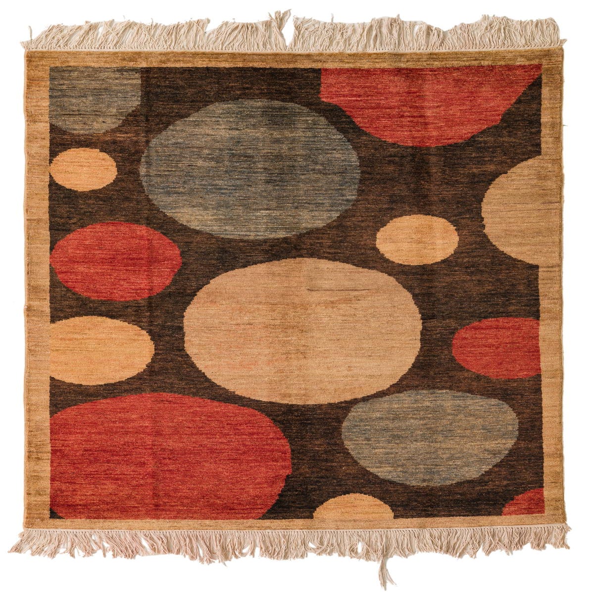 A 4x6 rectangular Modern Ziegler rug featuring an abstract pattern of large and small circles in shades of red, blue, and tan on a dark brown background, with a tan border and fringe.