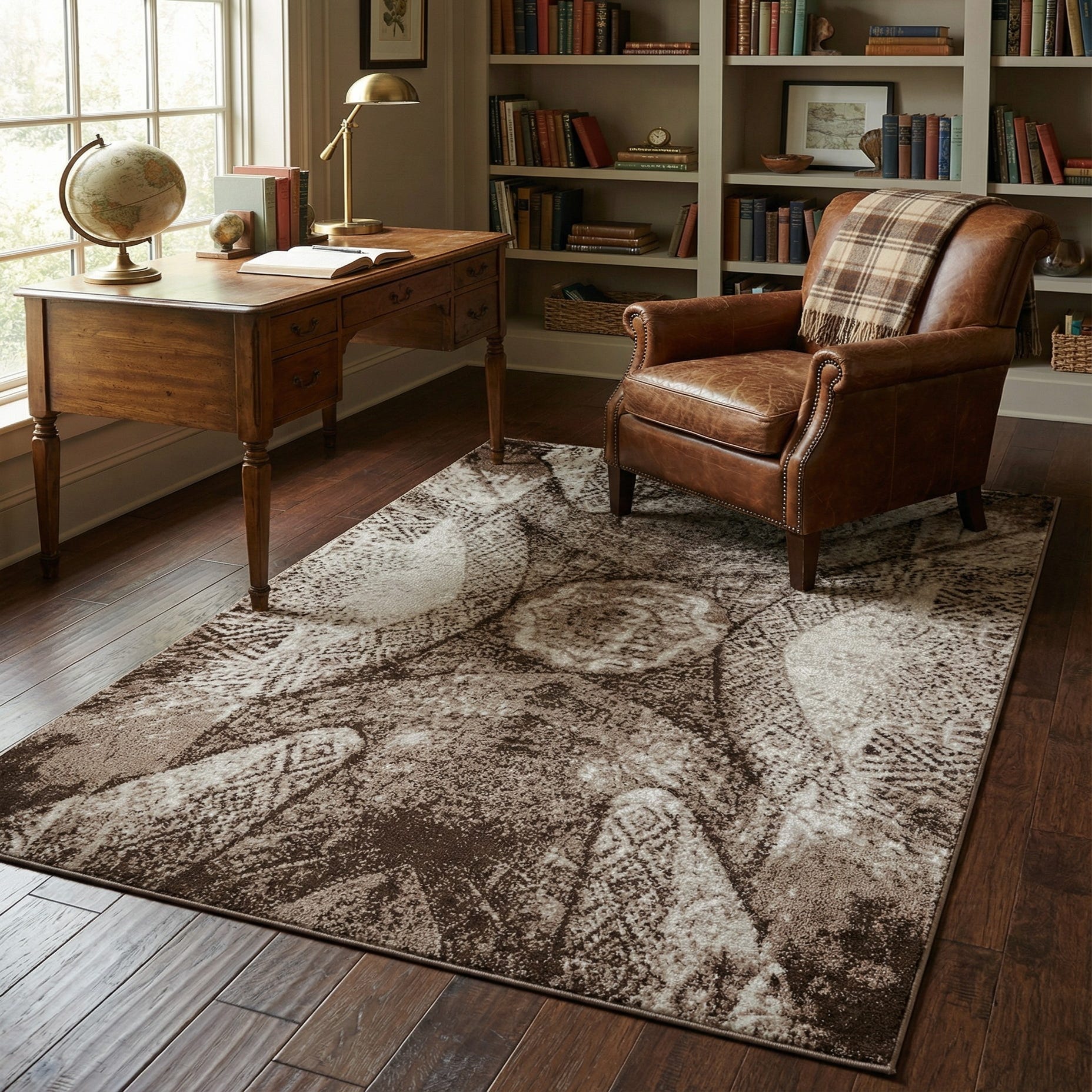This rug works well to ground a cozy seating area or to sit beneath a coffee table in a compact living room, and it can also add warmth to a reading nook or home office. The brown, beige and ivory palette pairs naturally with warm wood tones, leather seating, neutral linen upholstery, or industrial metal accents, lending itself to transitional, modern farmhouse, or relaxed contemporary interiors.
