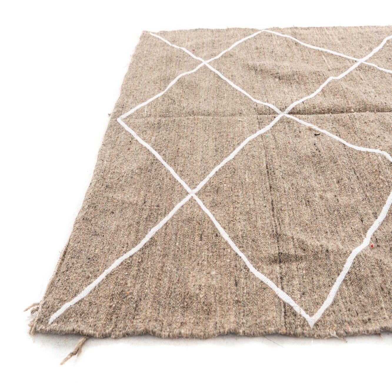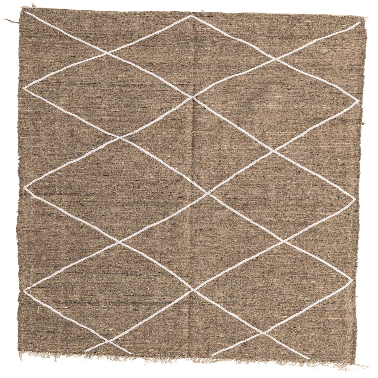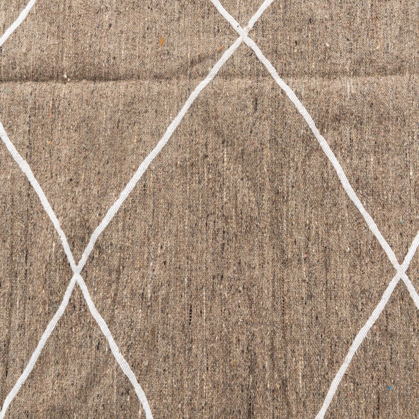 This Moroccan hand-knotted area rug, measuring 4x6, is crafted from 100% wool, offering a durable and plush texture underfoot. Displaying a brown background, the rug's surface is adorned with a minimalist ivory geometric lattice pattern, which presents a timeless visual that can complement a variety of interior decor styles. The rug's semi-antique status, being 40-60 years old, adds a degree of historical value and character to this piece. Finished with fringe at both ends, it completes the rug's traditional aesthetic.